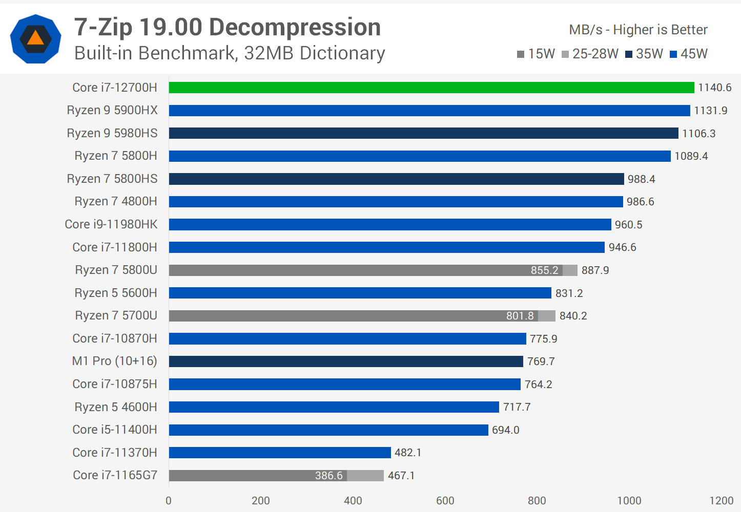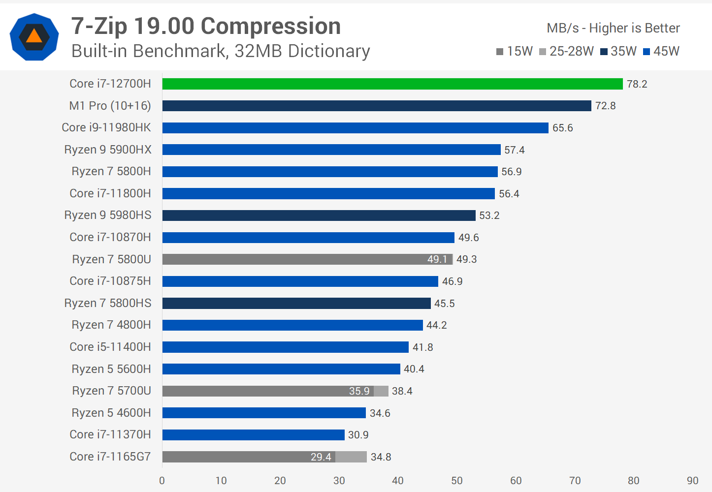 Next up is 7-Zip compression. This workload loves the Alder Lake design and the architectural benefits it brings, including powerful P-cores. The 12700H dominates the 11800H with a 39 percent performance uplift, and we see similar margins to AMD processors like the Ryzen 7 5800H.