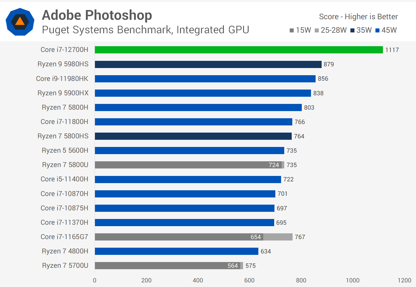 The 12700H is an absolute beast in Adobe Photoshop. Combinations of higher lightly-threaded performance, faster integrated graphics, faster memory and better cache systems allows the 12700H to destroy the 11800H: it's 45% faster, the second highest margin recorded between these parts after Excel. This gives Intel a dominant lead over AMD as well, 33% faster than the Ryzen 9 5900HX, so if you're a heavy Photoshop user you'll want Alder Lake.
