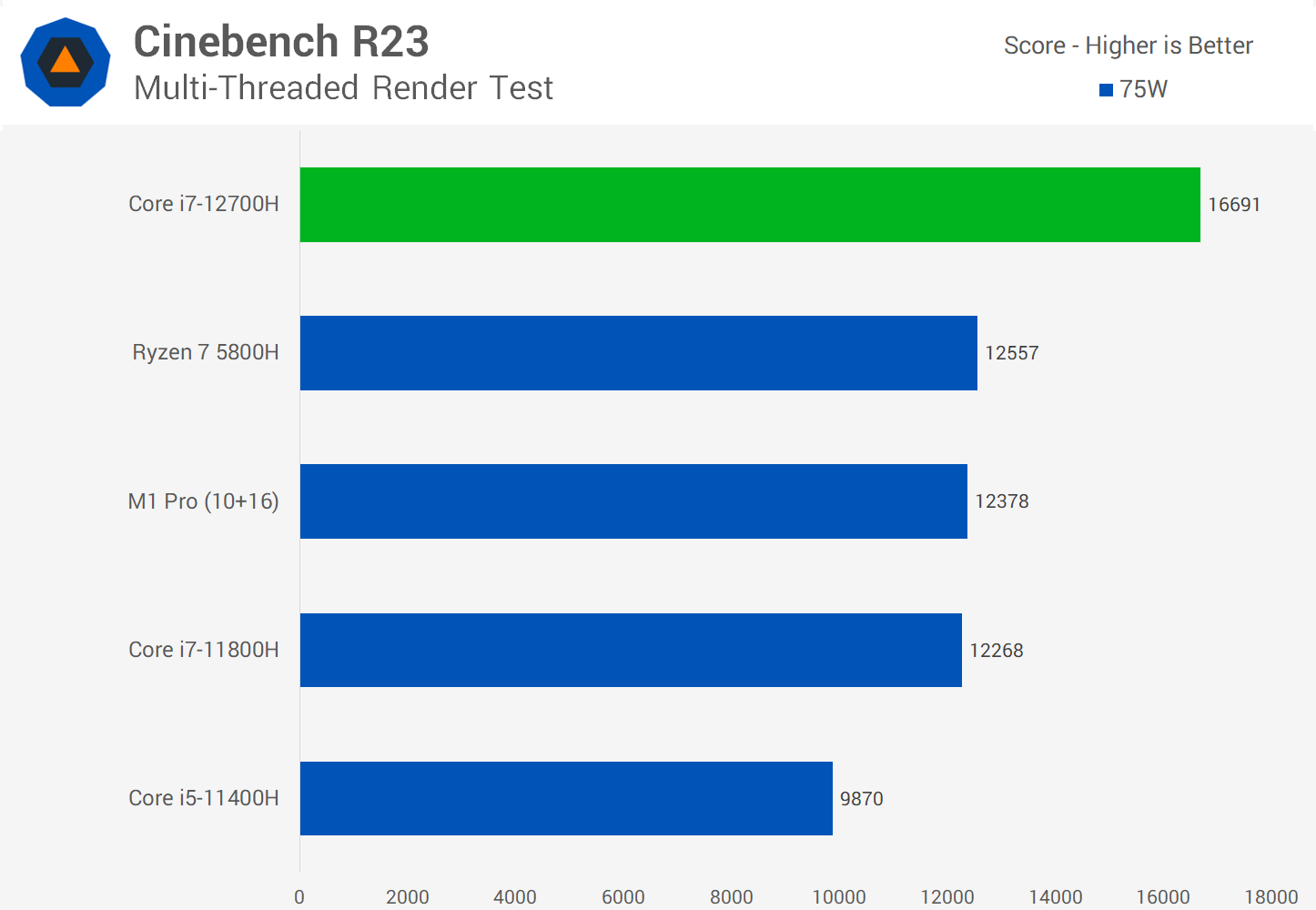 Intel is able to extend its lead when looking in the 75W power class. The 12700H is 36% faster than the 11800H here, and is now beating the Ryzen 7 5800H by 33%, up from a mid-20s improvement in the lower power class.