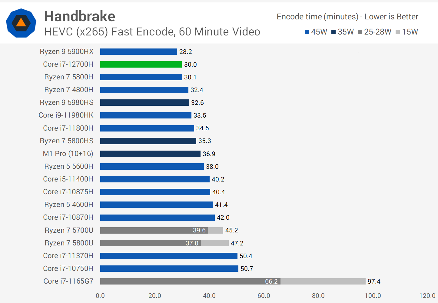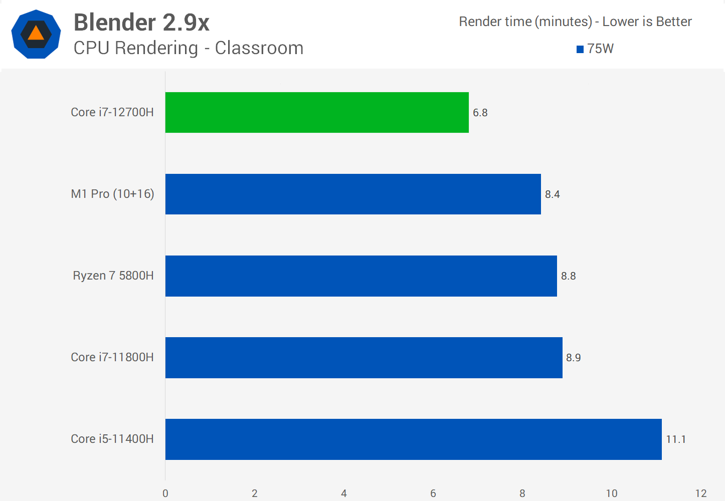 But like in Handbrake, when the 12700H is given 75W of juice to work with, it can accelerate beyond the other processors we've looked at to post quite an impressive score that makes this new generation well suited to CPU rendering.