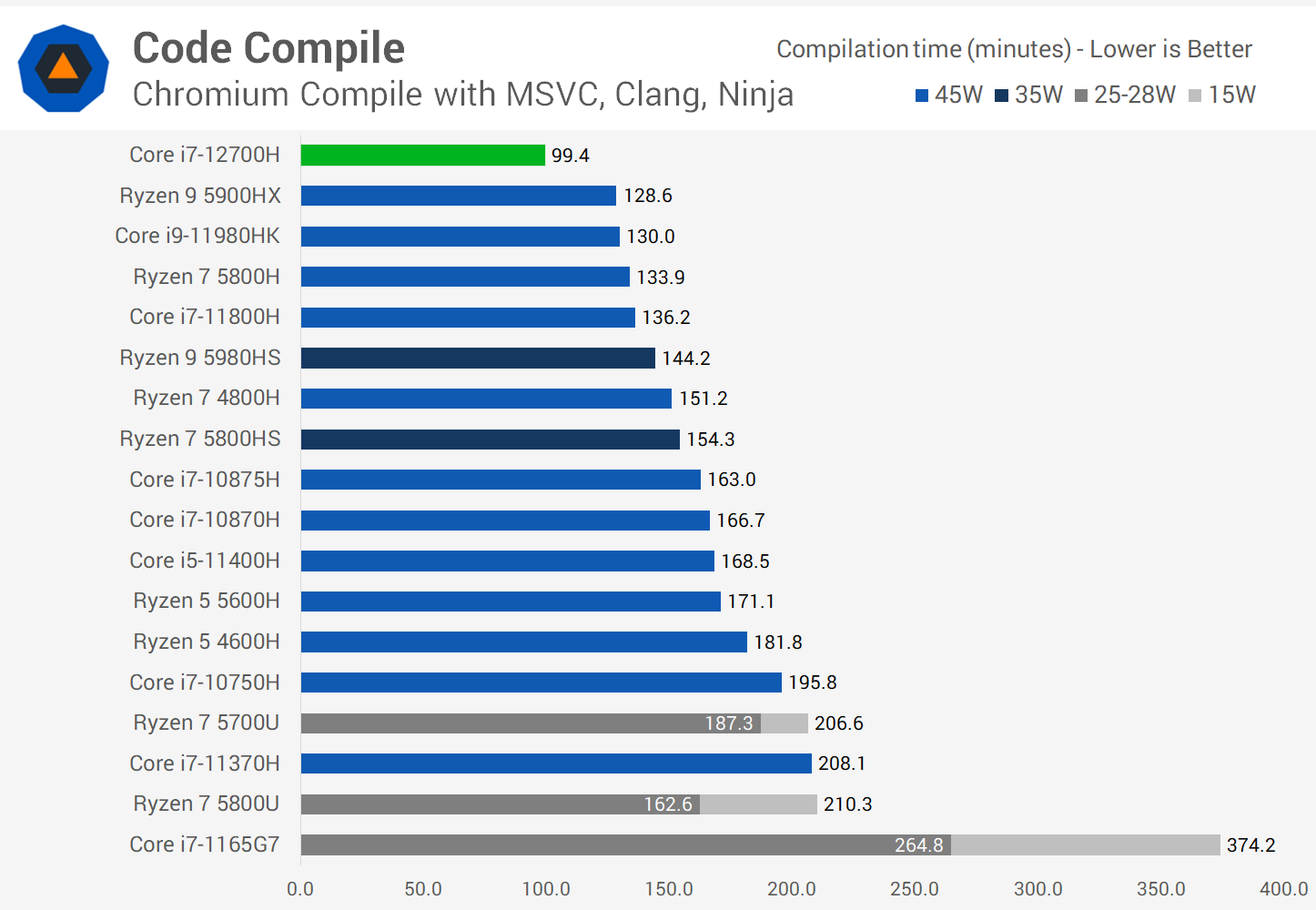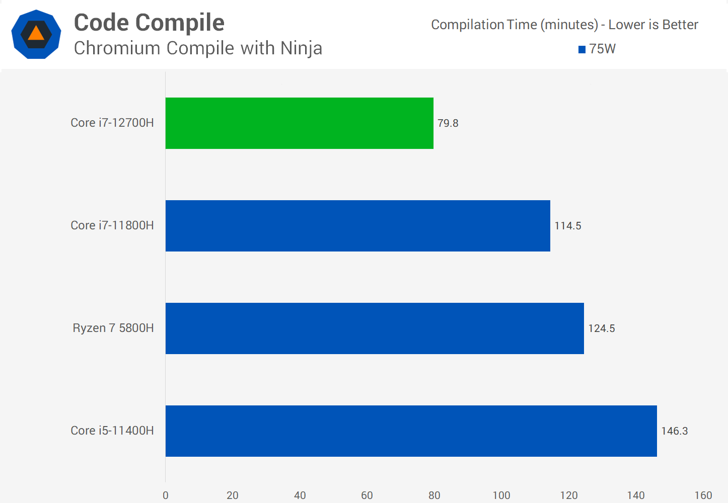 At 75W it's not even close, the extra power shaved off 20 minutes from the compile time on the 12700H which leaves previous generation parts in the dust. Another great example of Alder Lake shining particularly well at high power limits.