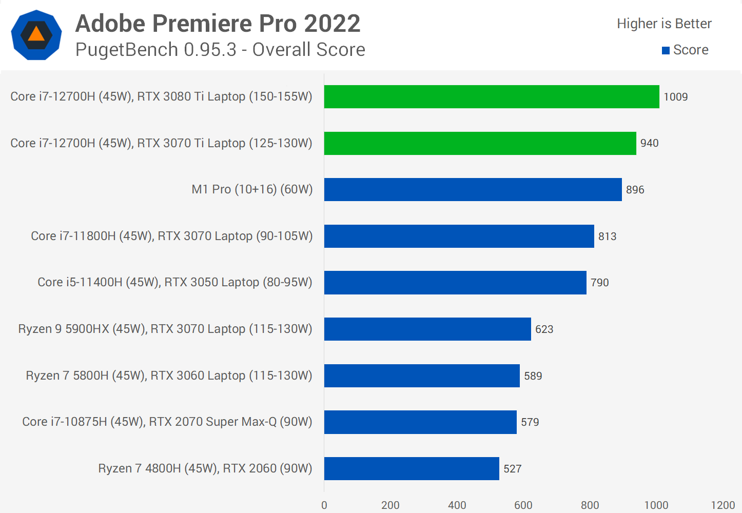 In Adobe Premiere Pro, the Core i7-12700H is the fastest CPU that we've tested to date. The overall score puts both the RTX 3080 Ti and RTX 3070 Ti configurations above the Apple M1 Pro, and well above previous generation processors. In particular, it dominates Ryzen and while the GPU is also faster than previous configurations, it's still a very impressive result.