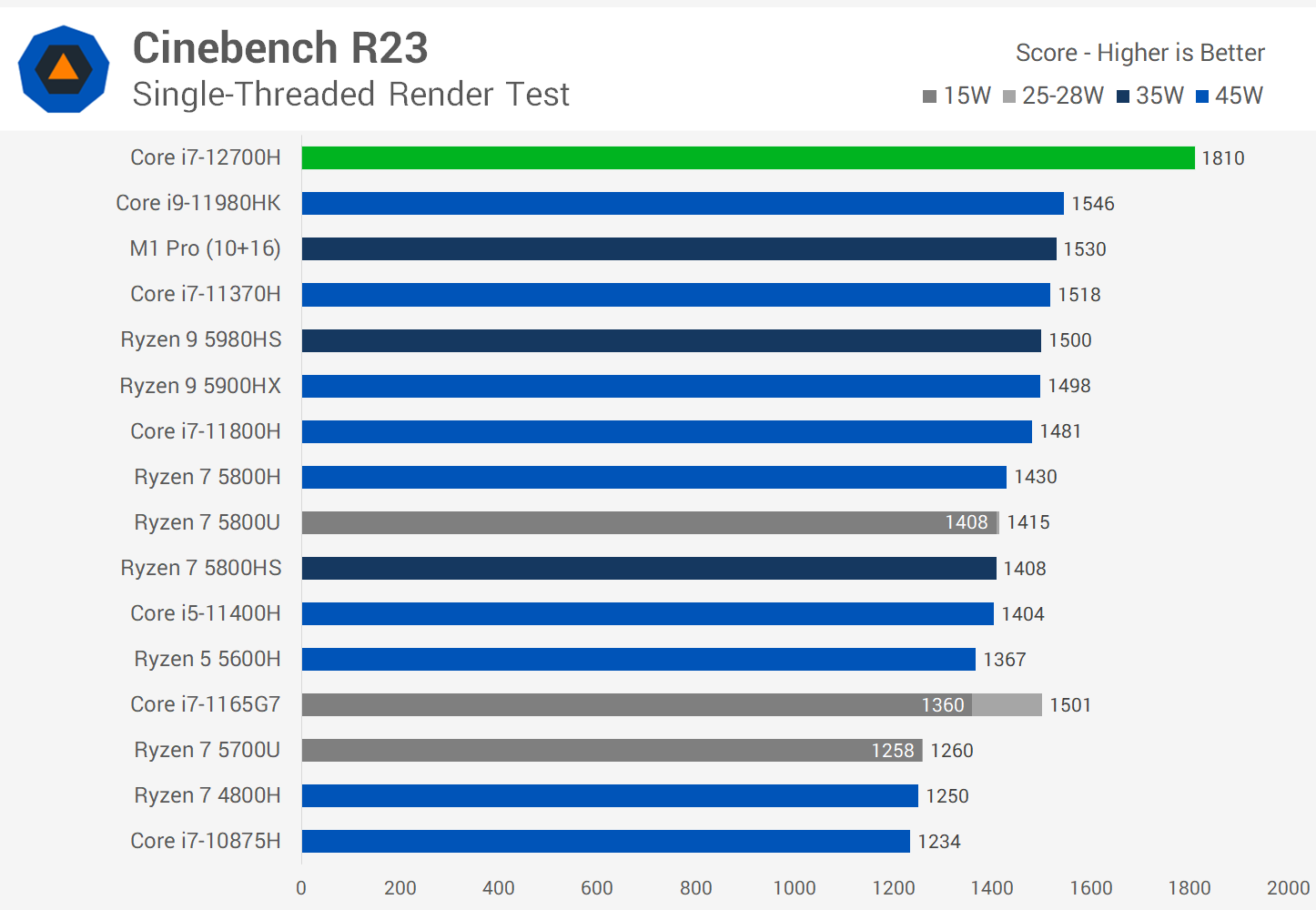 We'll start with everyone's favorite, Cinebench R23 multi-threading. The Core i7-12700H is the fastest laptop CPU we've tested to date, beating all other contenders including the Ryzen 9 5900HX and Apple's M1 Pro, even when run at just 45W.