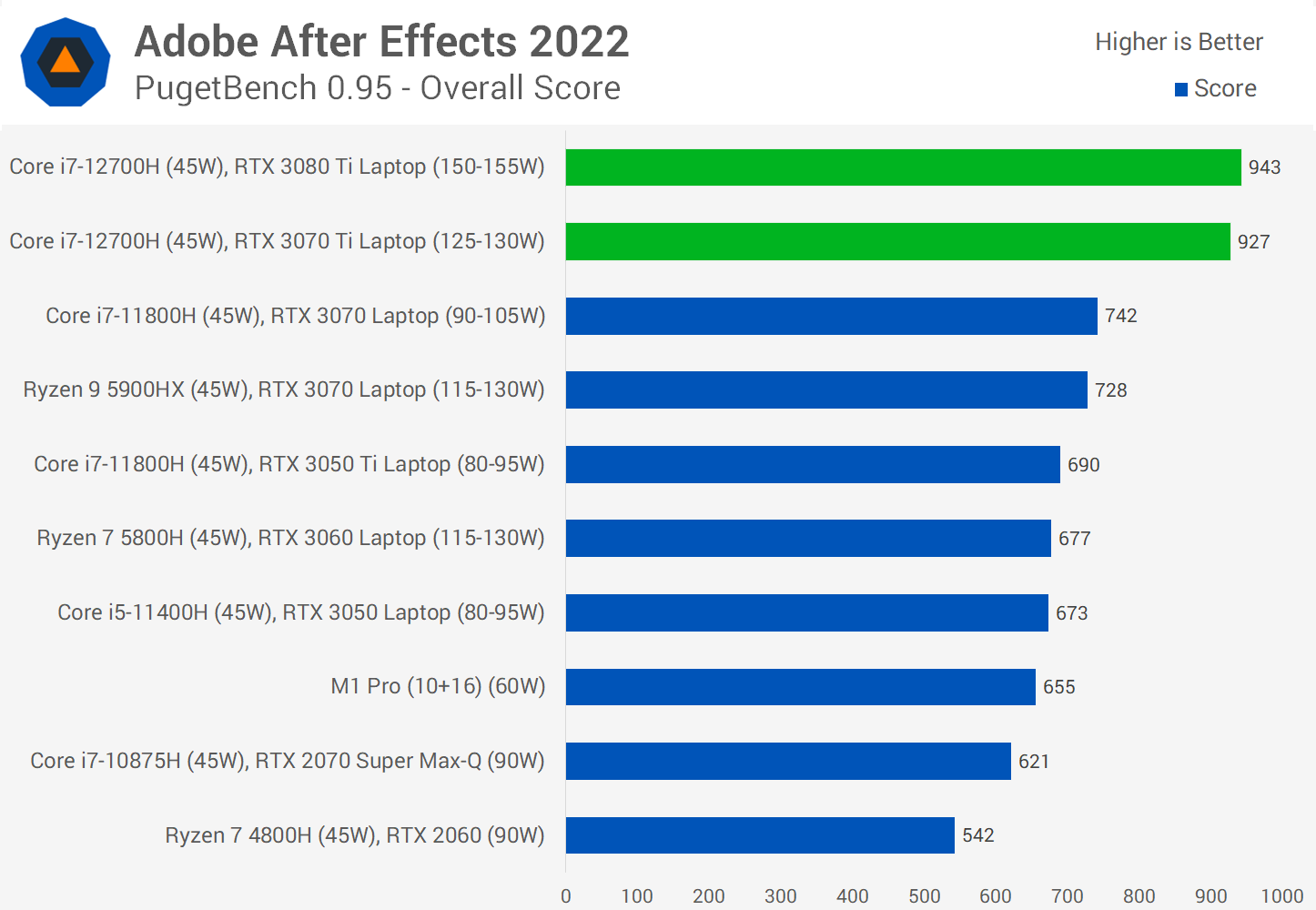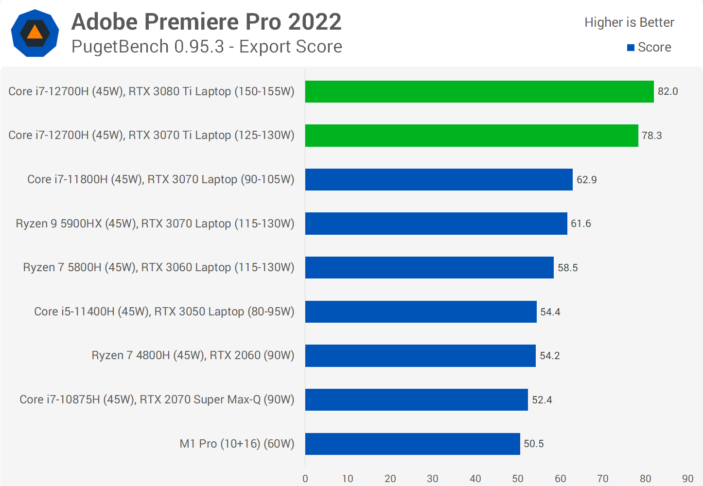 Part of that comes down to the export score. The full performance available with these new laptop configurations is 25% faster than a previous-gen configuration, comparing 12700H + 3070 Ti, to 11800H + 3070.