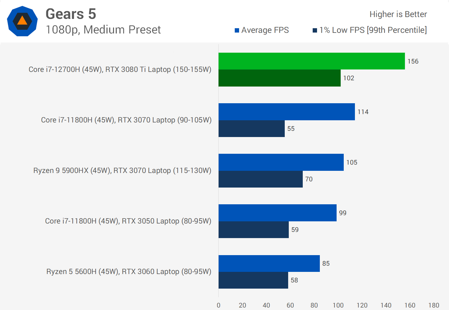 For the most part, your laptop benchmark charts are going to look like this. Even though we're benchmarking Gears 5 on Medium settings, the game is still relatively GPU bound, so the gains we see here are not attributable to the CPU, but to differences in the GPU.