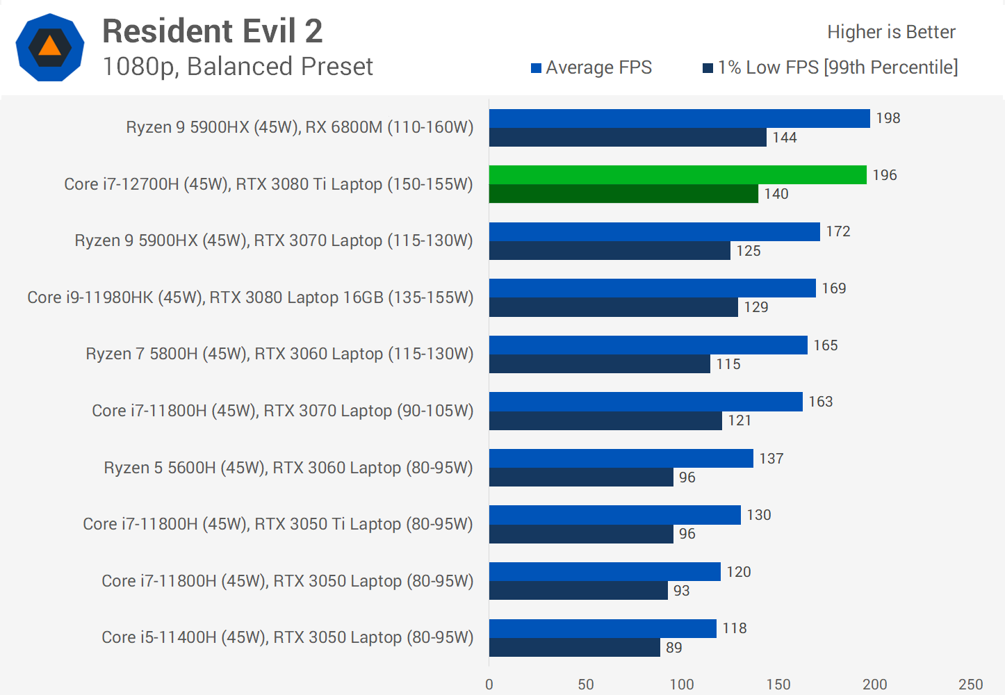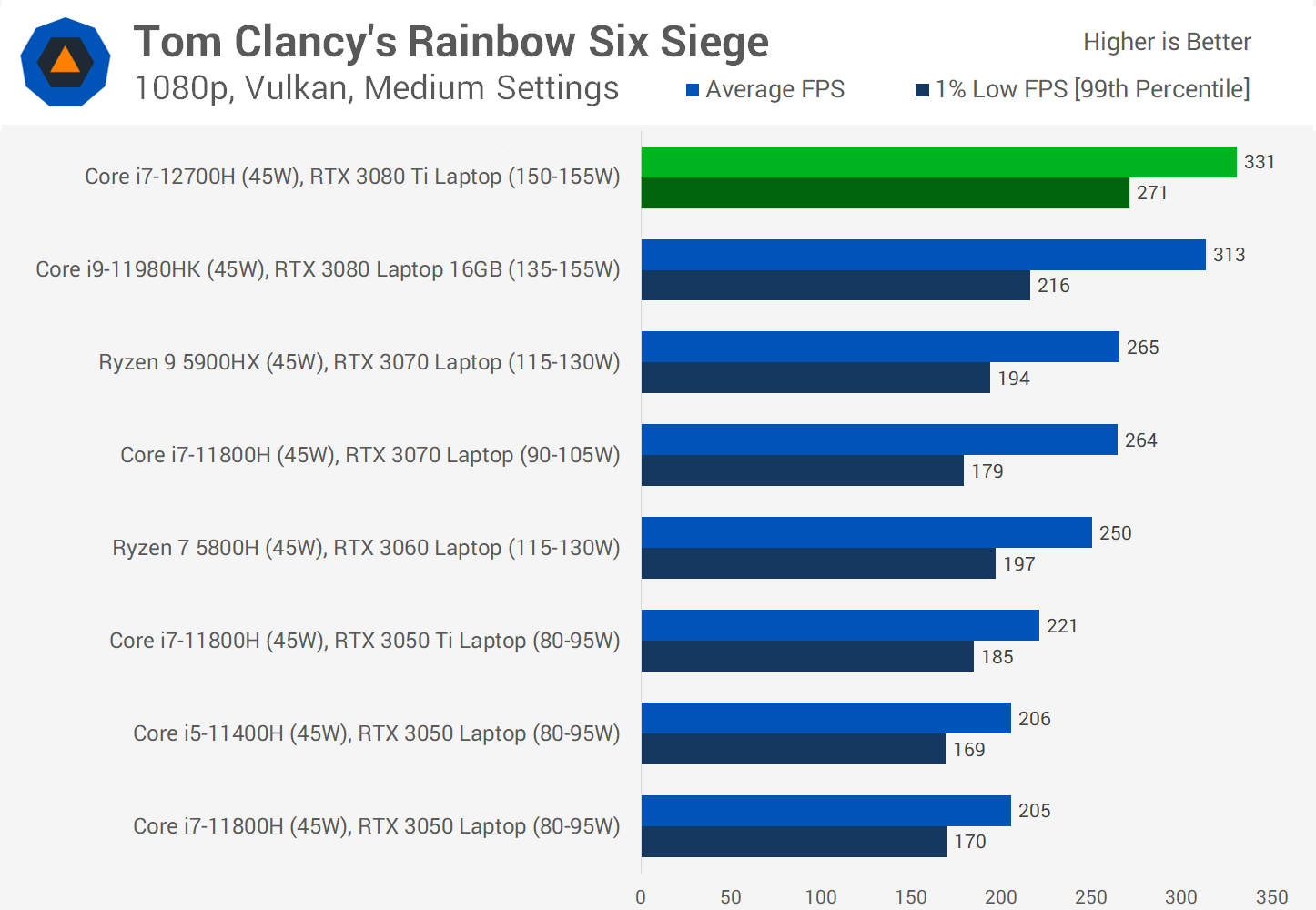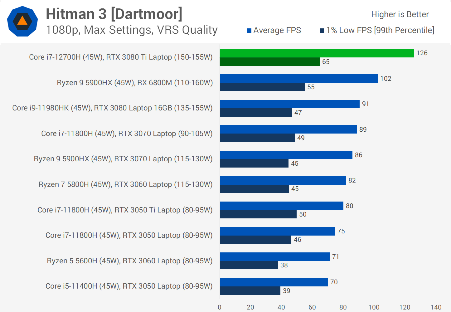 As best as we can gather from this title which is CPU limited to some degree using these settings, the Core i7-12700H and Ryzen 9 5900HX perform similarly when paired with powerful laptop GPUs. The 12700H does appear to be faster than prior Intel CPUs, but to what degree is hard to say given GPU differences.