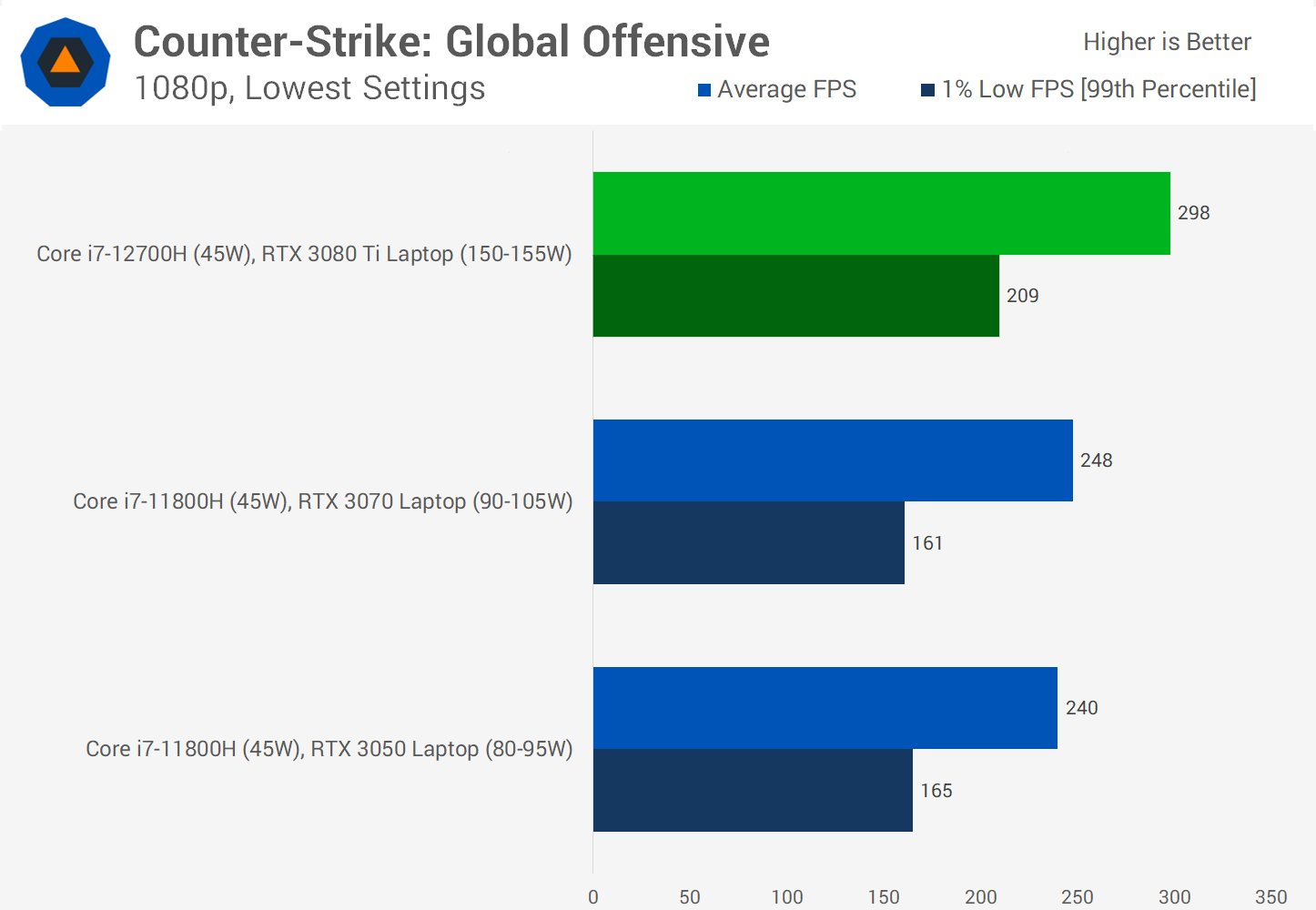 For this generation we've altered our CS: Go benchmark to use pro-level gameplay which is more representative of actually playing the game. This is a definitely CPU bound title using the lowest settings, and what we're seeing here is a decent performance uplift comparing the 12700H with the 11800H: a 20 percent increase to average frame rates. That's right in line with previous productivity results in single-thread and, to some degree, multi-thread as well.