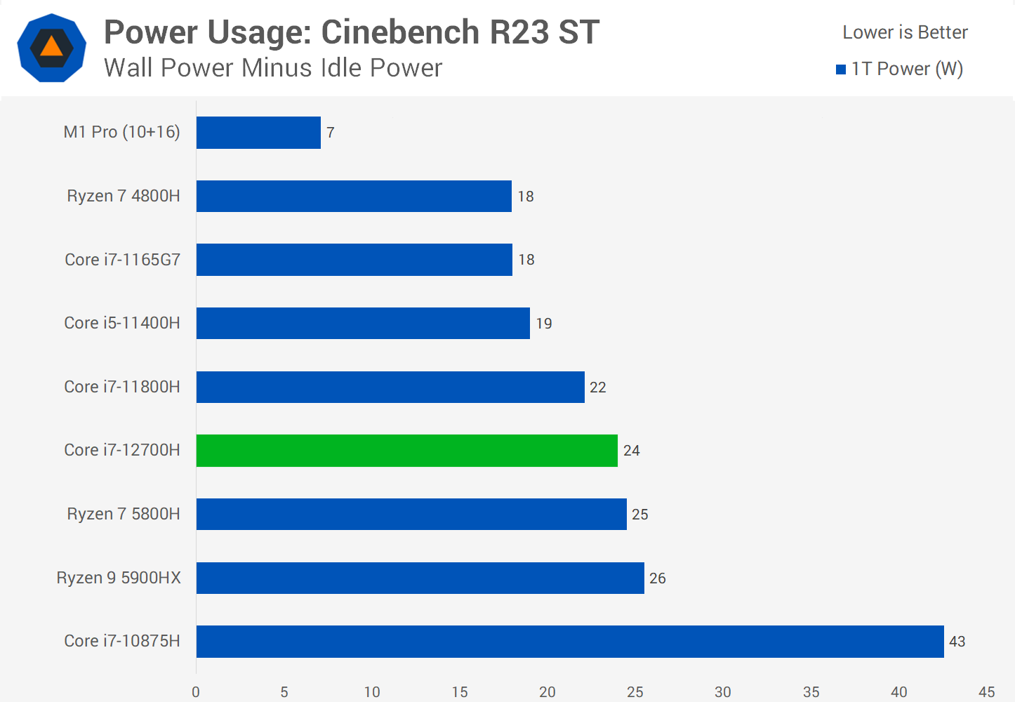This is achieved without consuming more single-thread power than other x86 processors, though the Arm-based M1 Pro is significantly more efficient.