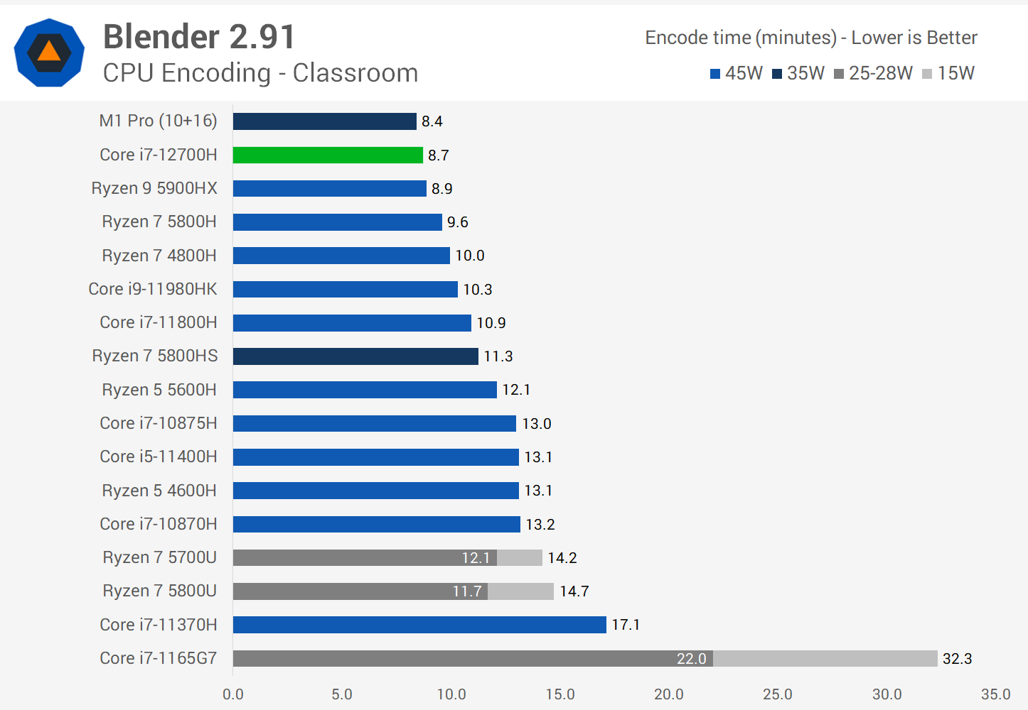 Blender CPU rendering is similar to the Handbrake results, in that the Core i7-12700H at 45W sits among the pack that includes the 5900HX, 5800H and M1 Pro, while delivering a 25% performance gain over the Core i7-11800H. That's a great generation on generation improvement, however in this workload it's only able to close the existing gap between Intel, AMD and Apple.