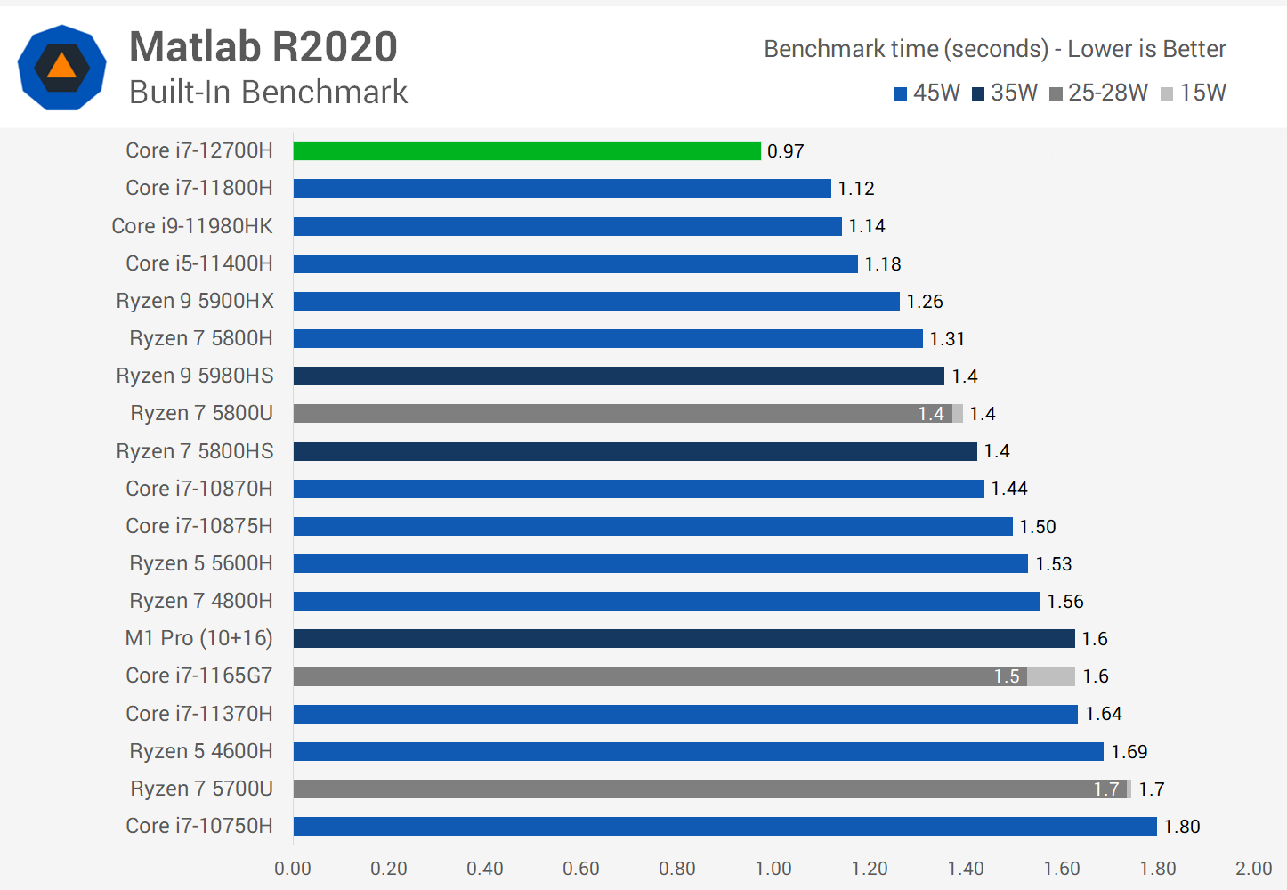 Matlab is a short, burst workload that's sensitive to things like cache and memory. Intel was already the fastest in this benchmark with 11th-gen, so 12th-gen only pushes their lead further ahead.