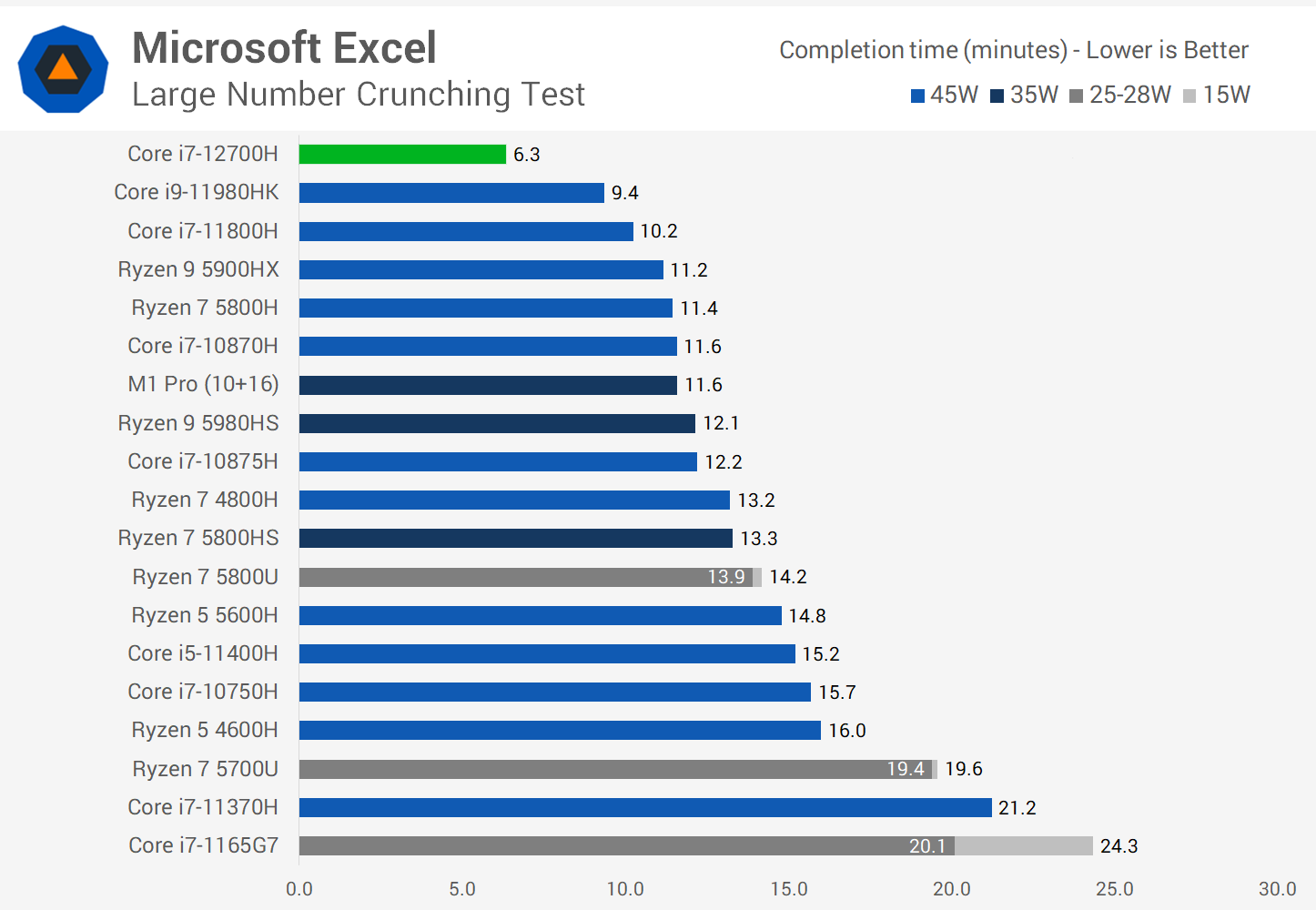 Our Microsoft Excel test is another one that's run primarily in the CPU's 115W boost state, so 45W vs 75W numbers aren't relevant. Once again Alder Lake crushes it here, delivering one of the highest performance gains we've seen, it's over 60% faster than the Core i7-11800H and a lot of that comes down to cache and memory again. This is well and truly desktop-level performance, basically matching the Ryzen 7 5800X.