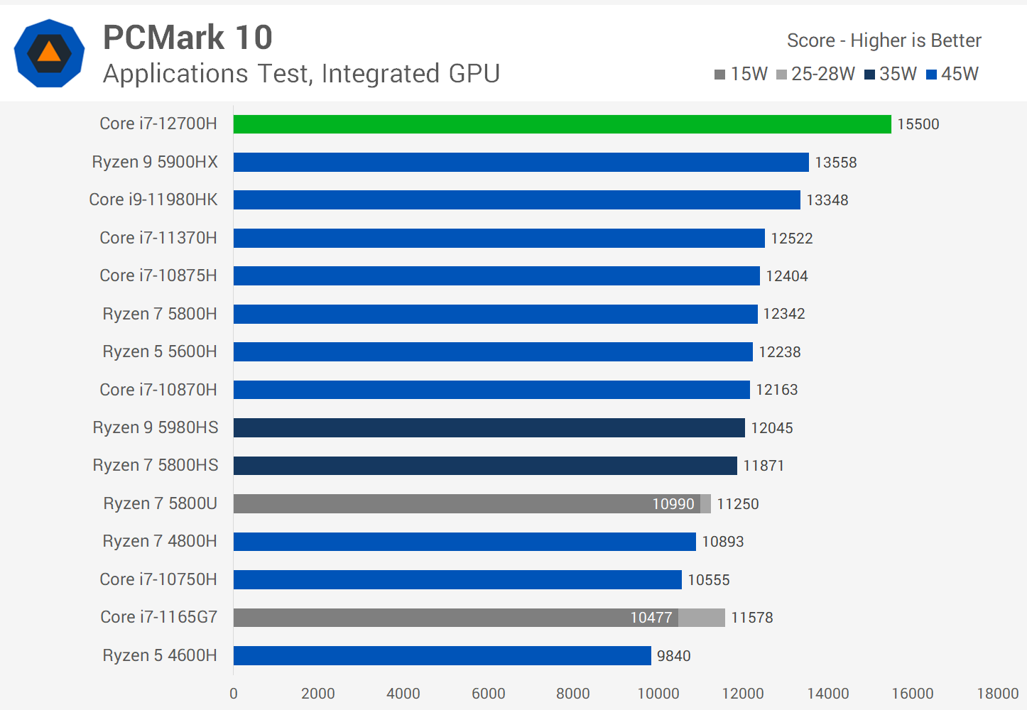 When it comes to the PCMark Applications test which measures Microsoft Office performance, the Core i7-12700H is able to put up a decent lead on other mobile processors thanks to its excellent single-threaded performance - and Office is mostly a lightly-threaded workload.
