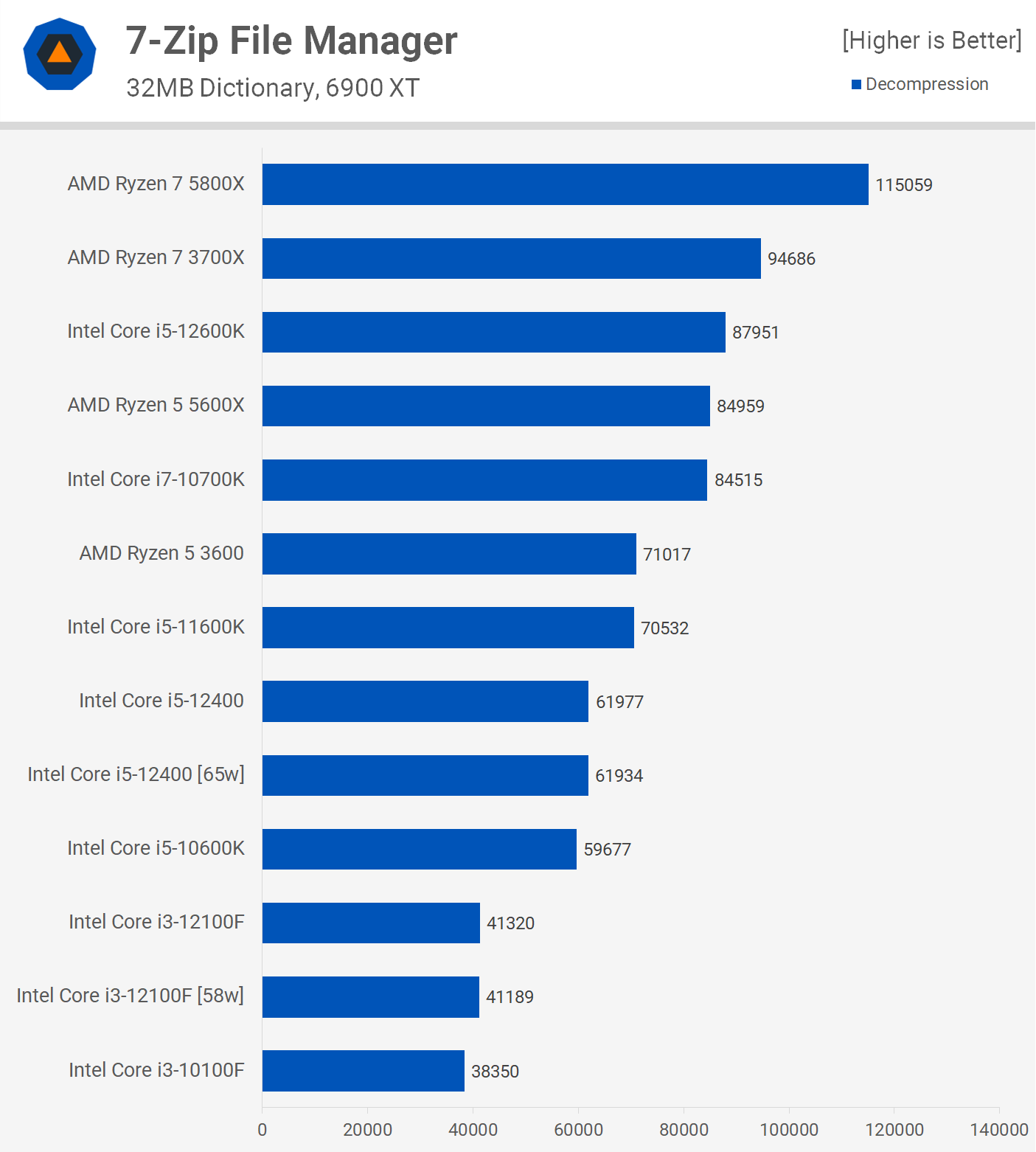 Moving on to 7-Zip File Manager results, the 12100F doesn't look super impressive when it comes to compression performance, but for a CPU that's just over $100, it's kind of great, offering a ~30% boost over the 10100F and just 20 - 22% less performance than 6-core parts in the Core i5-10600K and Ryzen 5 3600.