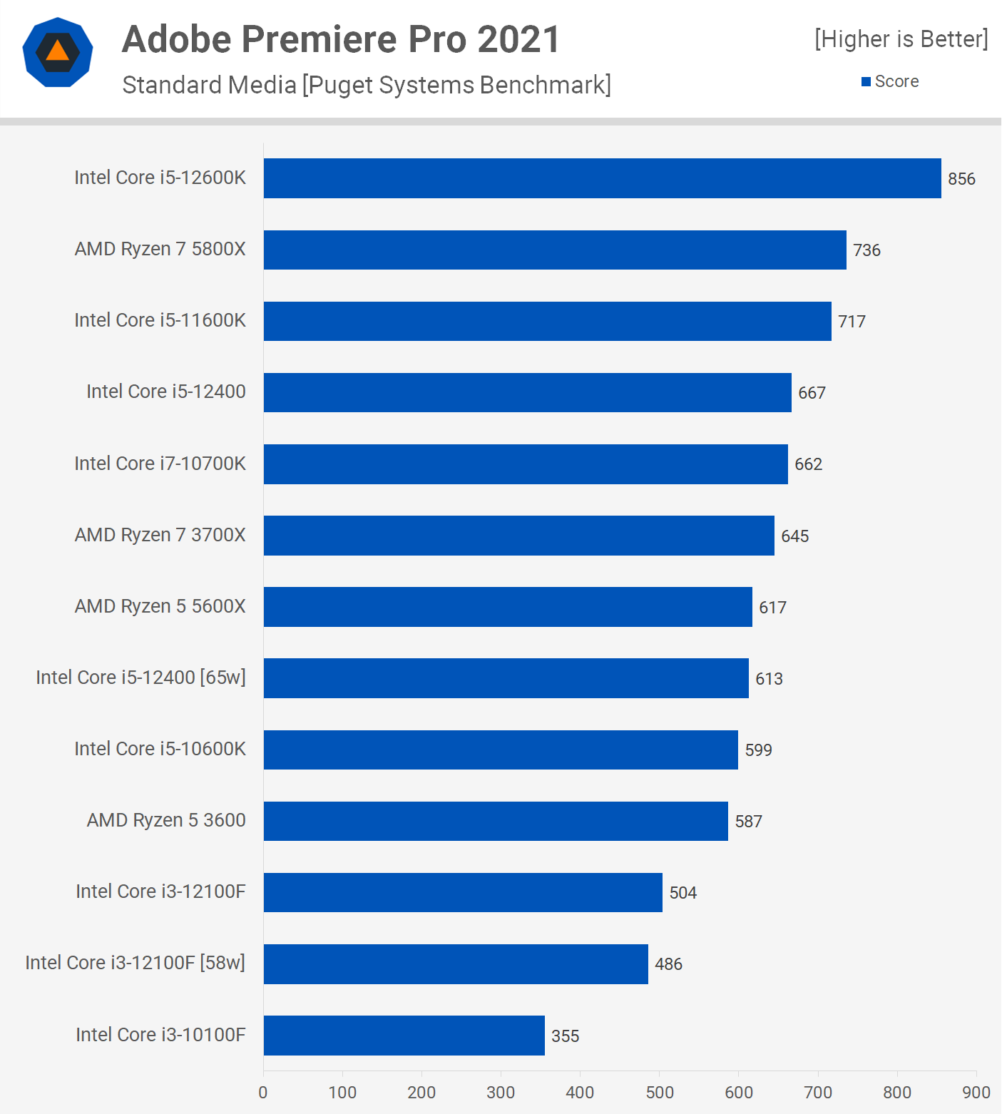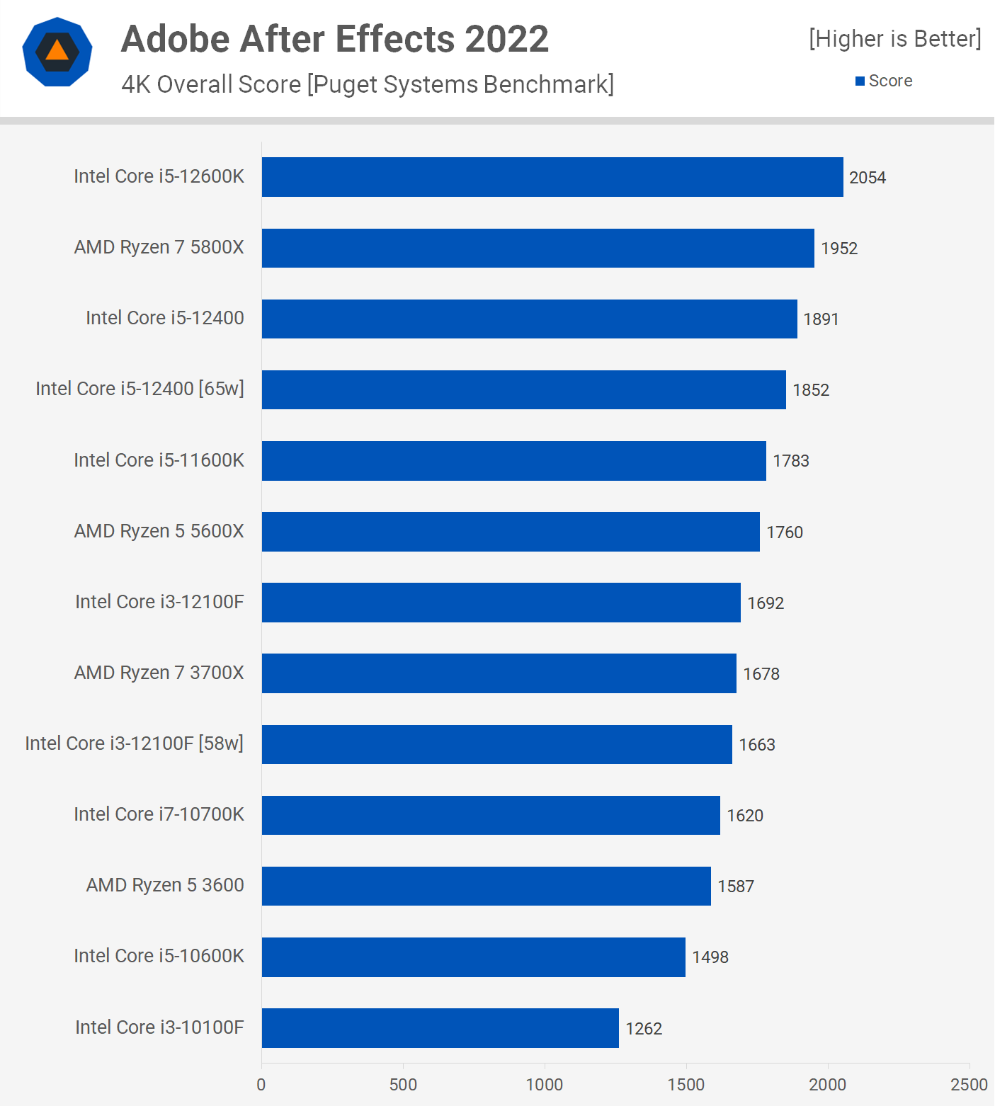 In Adobe After Effects the 12100F appears surprisingly capable, roughly matching the performance of the Ryzen 5 5600X in the Puget Systems Benchmark. I have no doubt that serious users making money from work with After Effects won't opt for the Core i3-12100F, but for those starting out this budget CPU doesn't seem like a bad option, despite being a lowly quad-core.