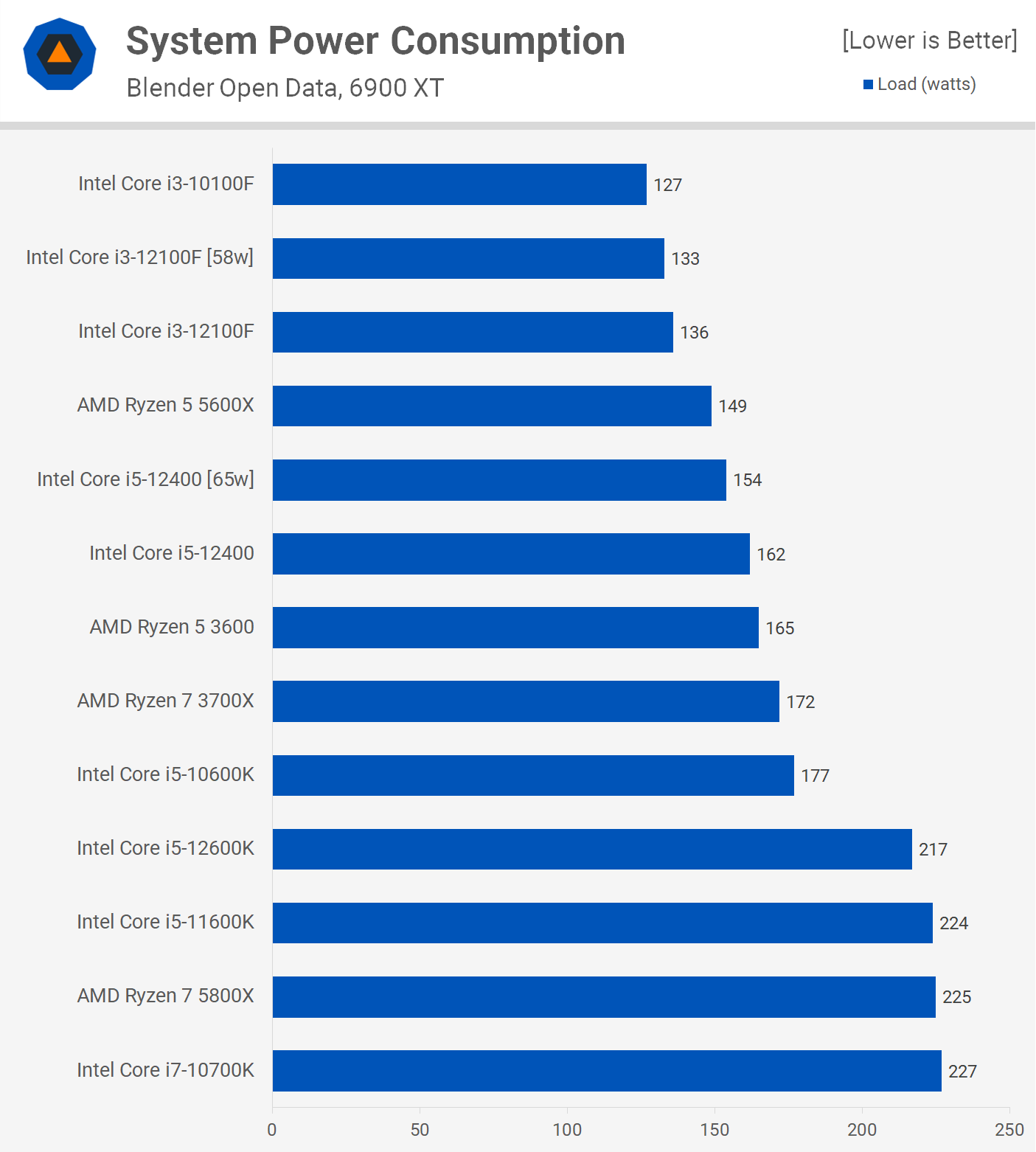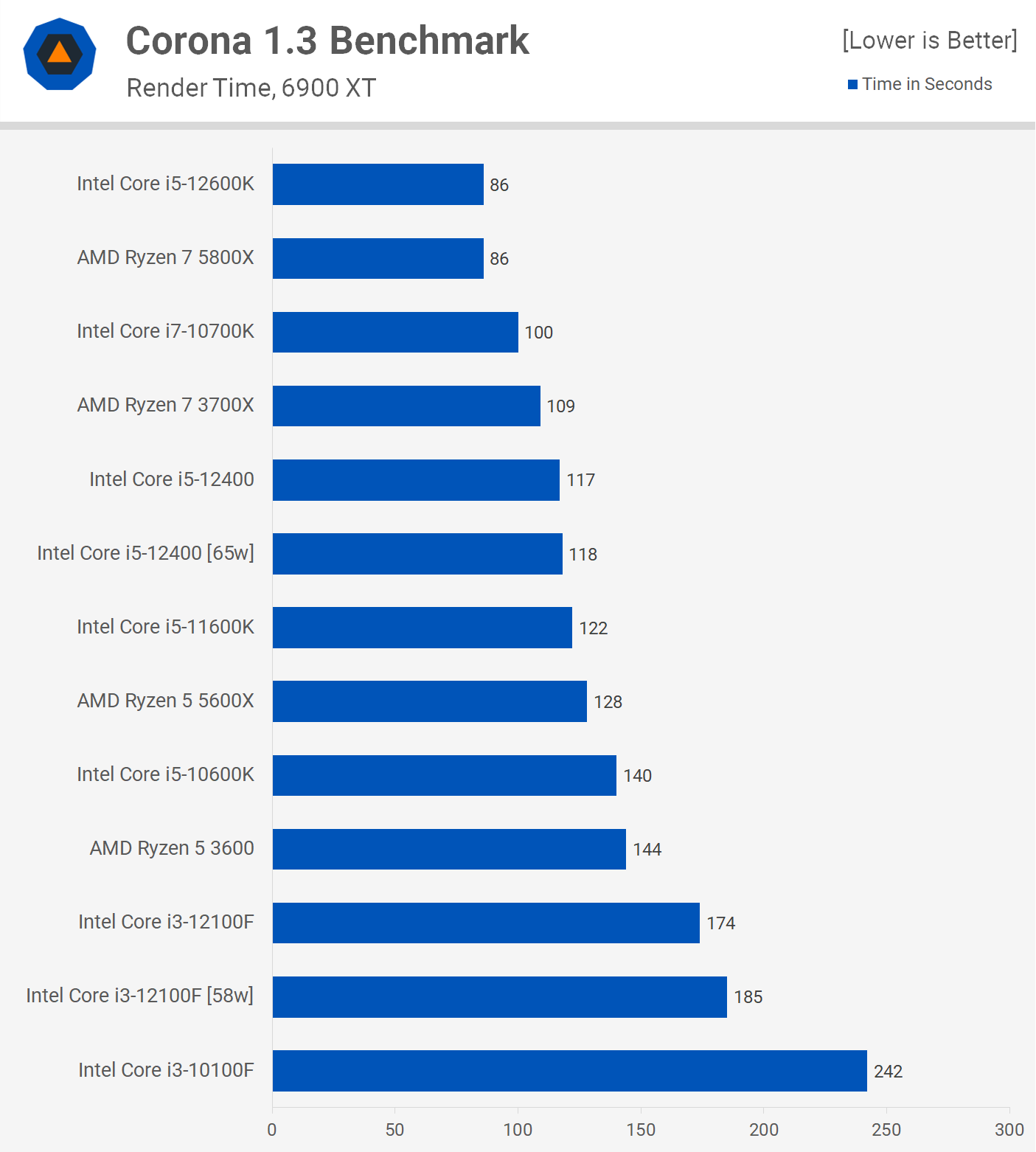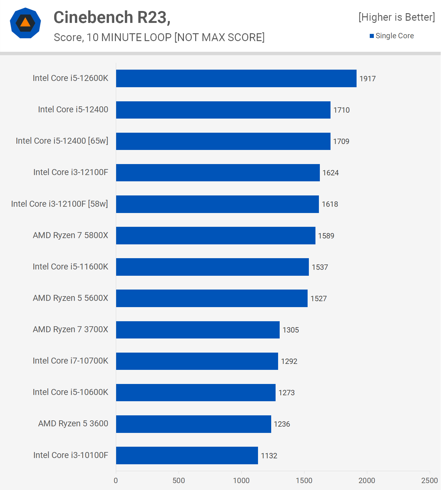 It's possible the package power reporting is inaccurate. Whatever the case, this is the resulting performance when limited to the 58w spec opposed to the 'unlimited' spec, lets say. In short, the 12100F was 39% faster than the 10100F and 17% slower than the Ryzen 5 3600.