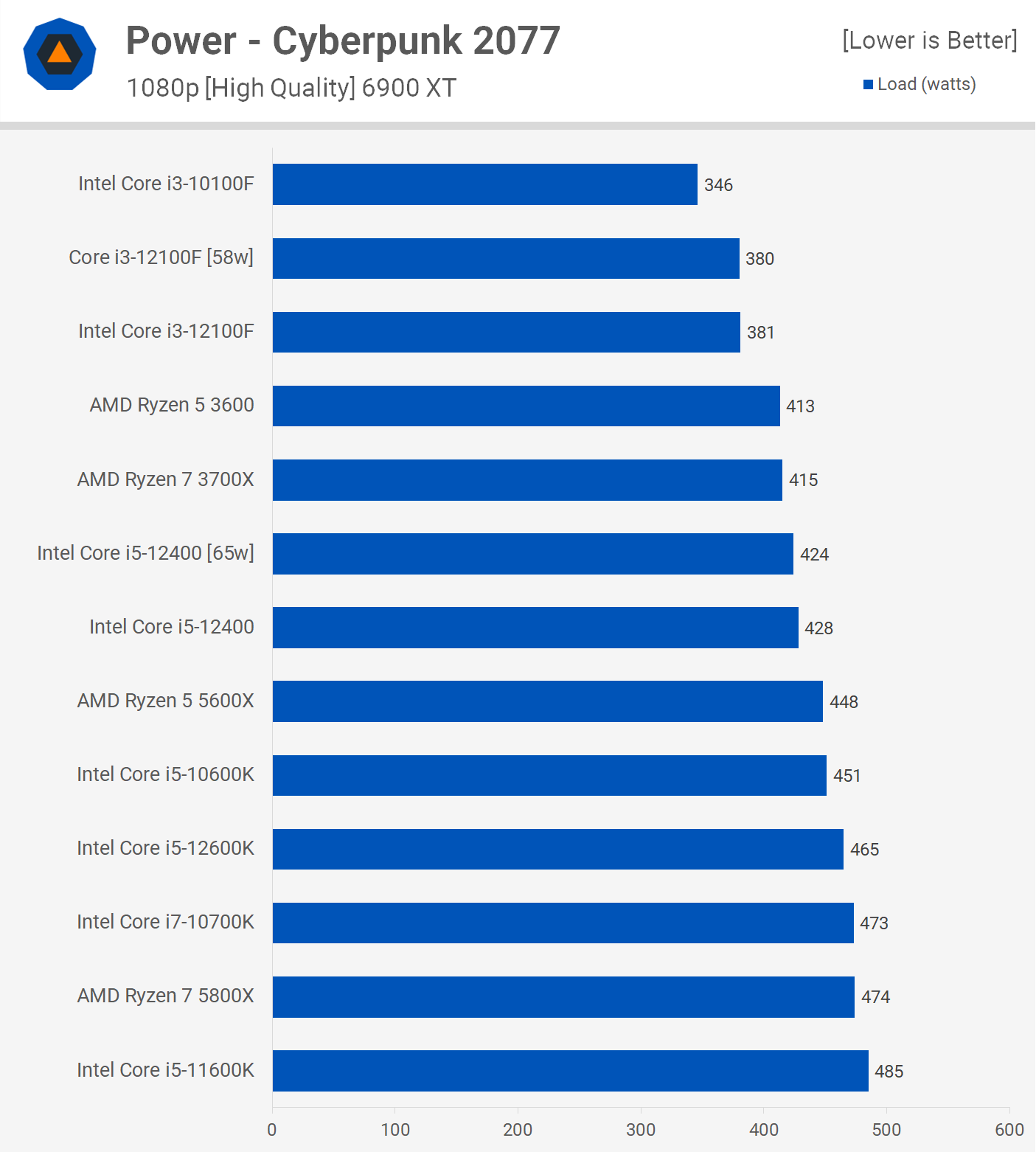 We also tested power consumption with Cyberpunk 2077 and the the 12100F looks impressive, increasing total system usage by just 10% over the 10100F for a 16% boost in performance. Basically, when paired with a mid-range graphics card, a 400 watt power supply would be overkill.