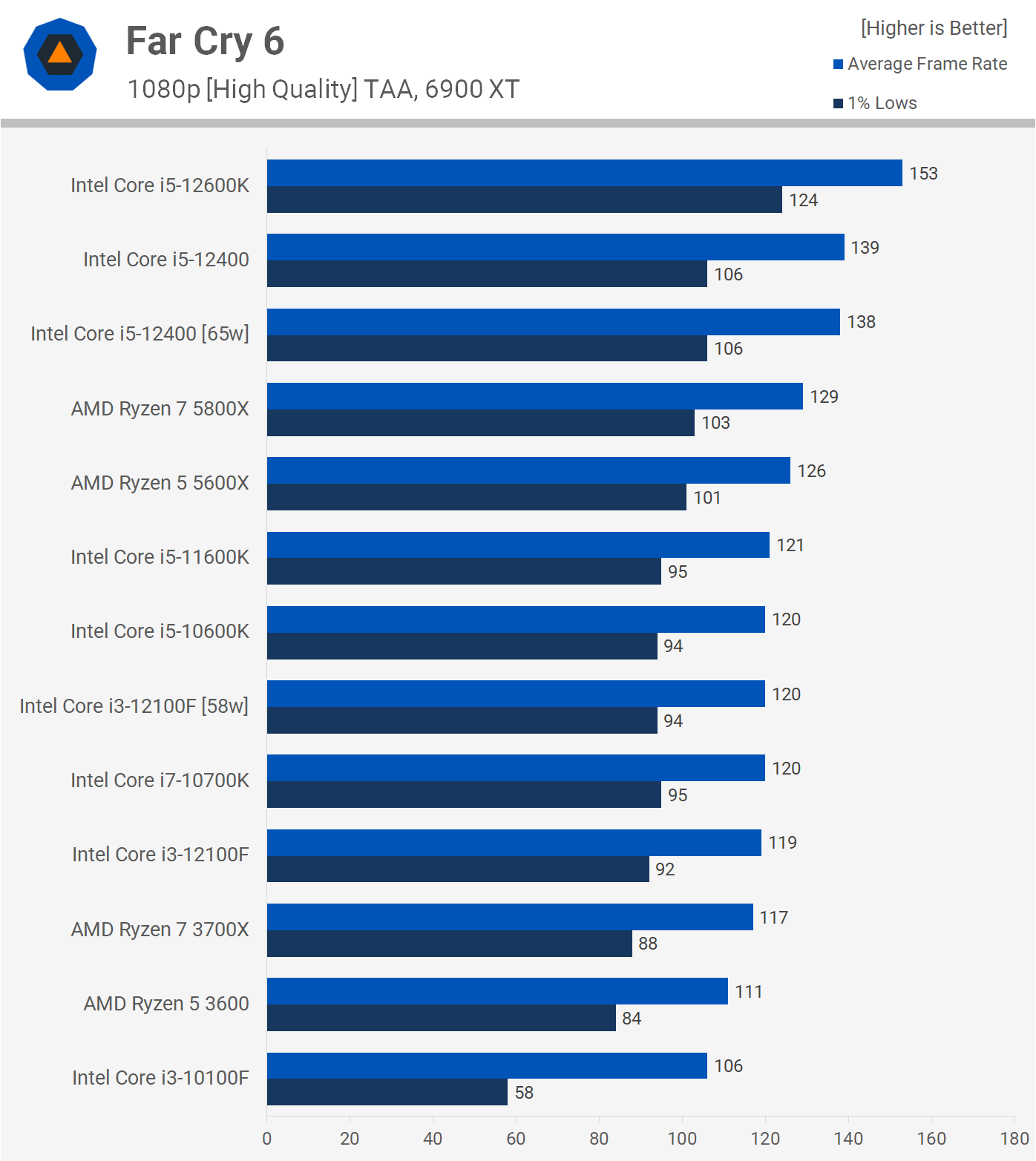 It was 19% slower than the 10600K and 11600K, and then 24% slower than the i5-12400, so those extra cores, and cache are certainly helping a lot. But 102 fps on average remains decent performance and it was a 16% boost over the previous Core i3.
