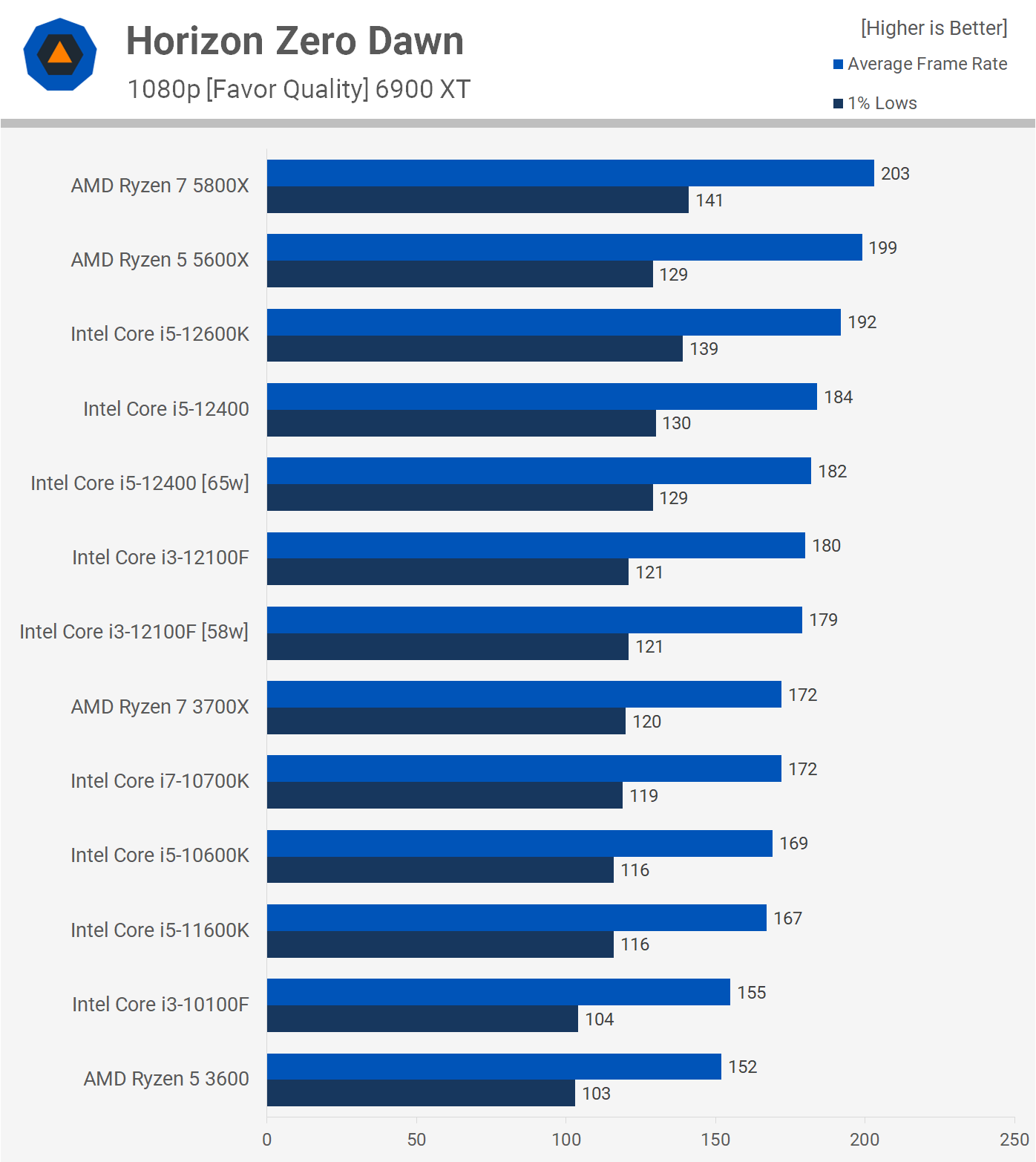 Horizon Zero Dawn isn't a core-heavy game, so we have another example where the 12100F performs well relative to other more expensive CPUs. Basically it's able to match the i5-12400 making it slightly faster than the 3700X and 10700K.