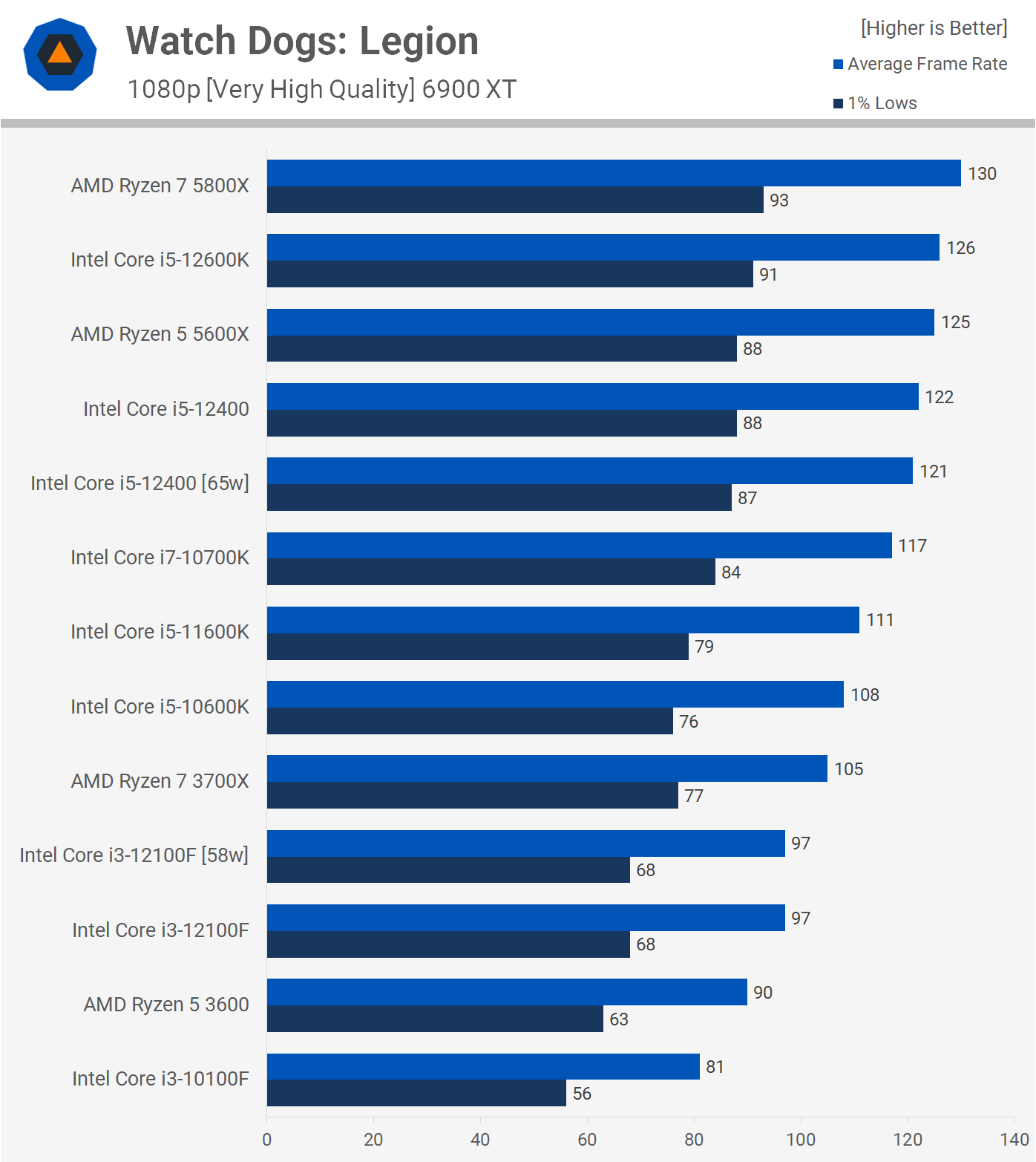 Moving on, we have Watch Dogs: Legion and although 97 fps on average is one of the weaker results from the batch of CPUs tested, the 12100F was 8% faster than the R5 3600 and 20% faster than the 10100F. Moreover, it was ~8% slower than the Ryzen 7 3800X and 10% slower than the Core i5-10600K, both of which are very capable gaming processors.