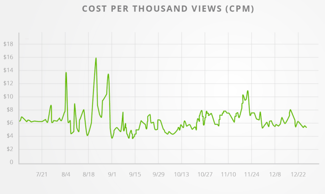 When the number of ads increases that fast, it would make sense that the value of the ads diminishes. Not this time. The cost per 1,000 ad views (CPM) stayed steady from August to December and was even a bit higher than before sometimes. If you're interested in specifics, read on: CPM in September: $5.21, CPM in November: $7.20, CPM in December: $5.94. More ads at the same price means someone is making a whole lot of money.