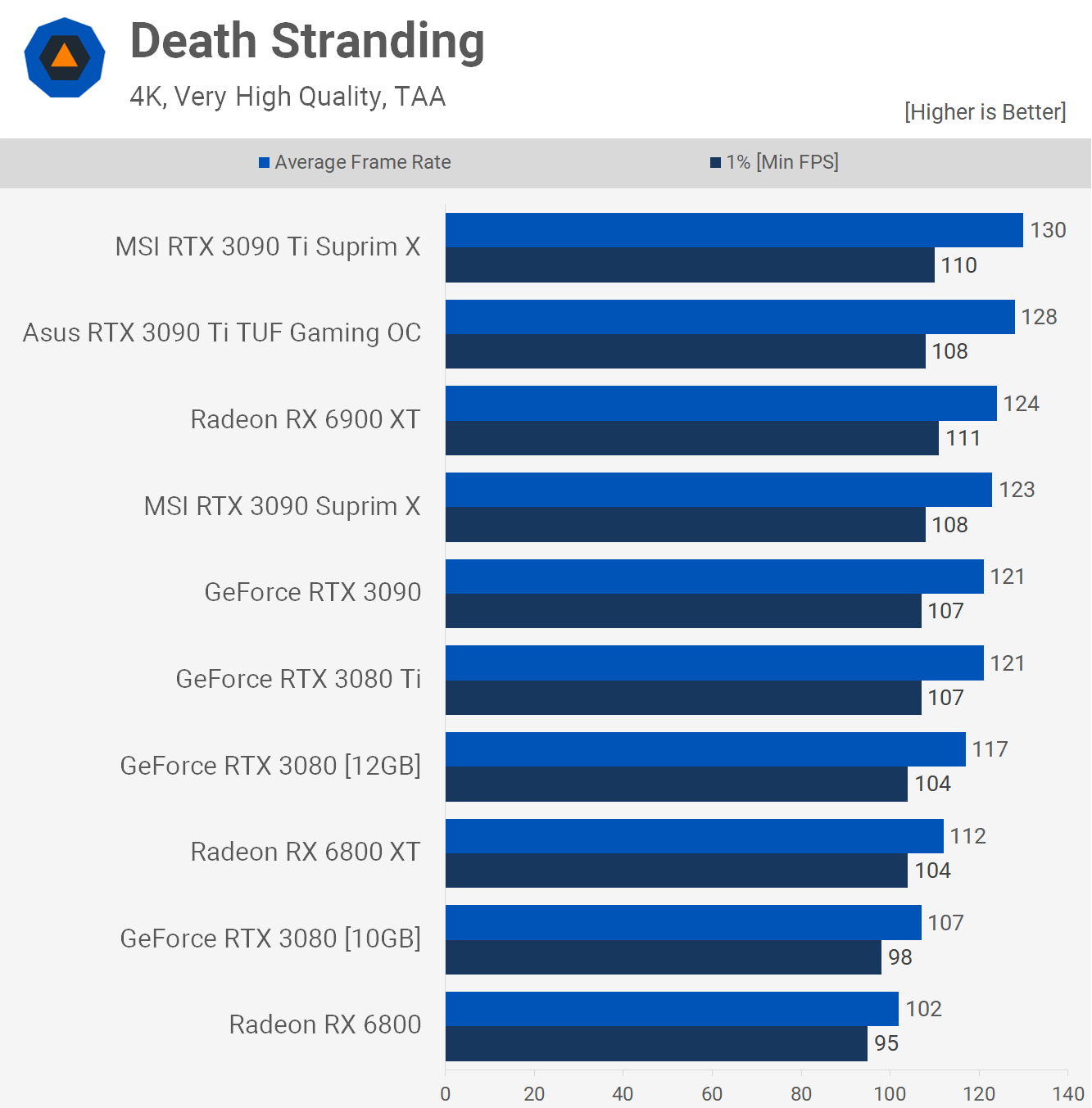 Moving on, there's little to see in Death Stranding, here the Suprim X models are separated by just a 6% margin.
