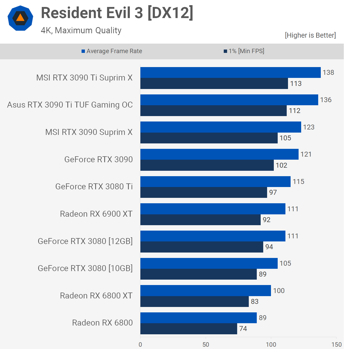 Doom Eternal was no challenge for the 3090 Ti, though the same was also true of the 3090 and here the Suprim X models are separated by a mere 4% margin.