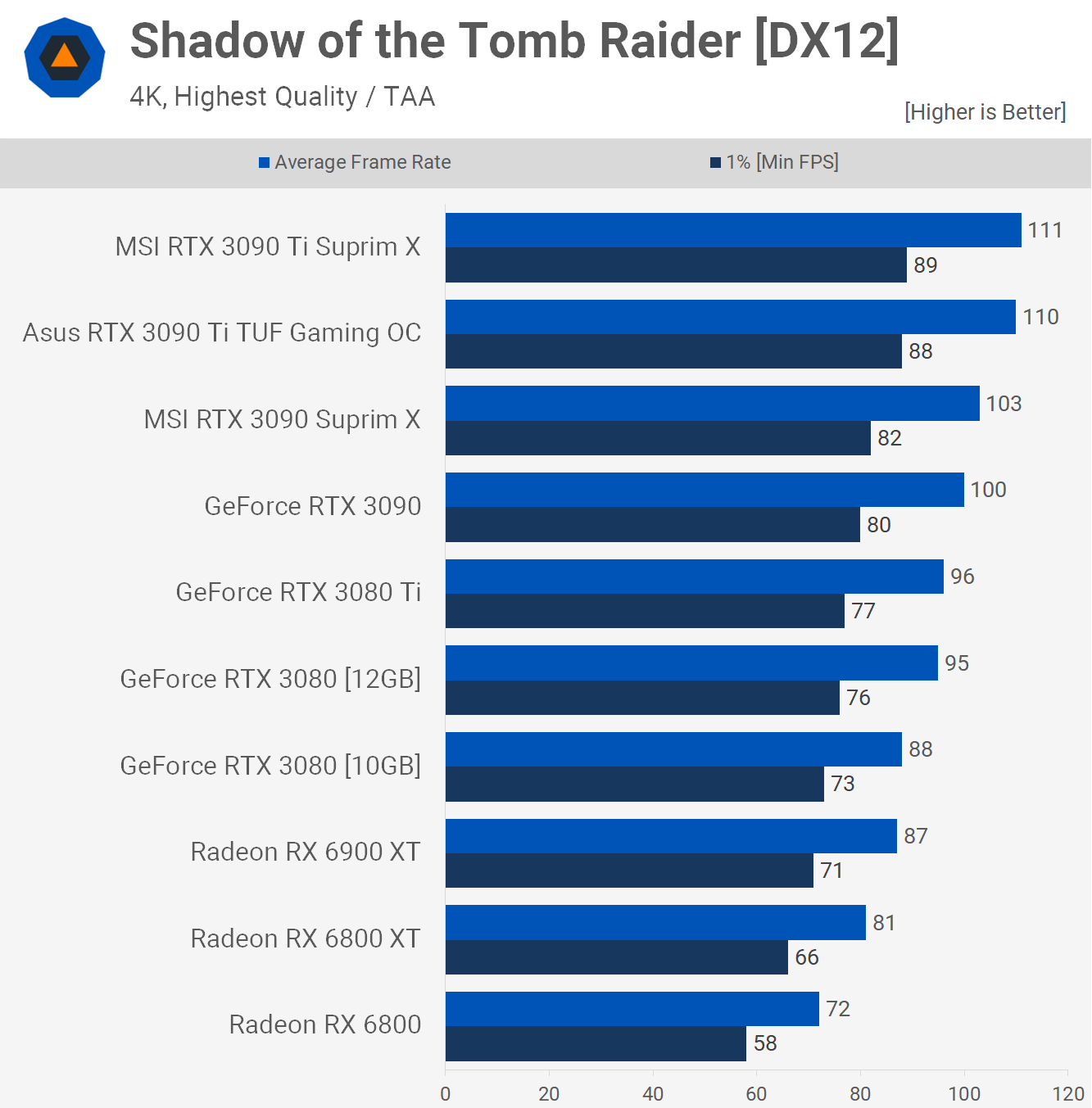 Still, the Suprim X 3090 Ti was 3.5% faster than the Asus TUF Gaming OC model, though it was only 9% faster than the older Suprim X version of the original 3090.