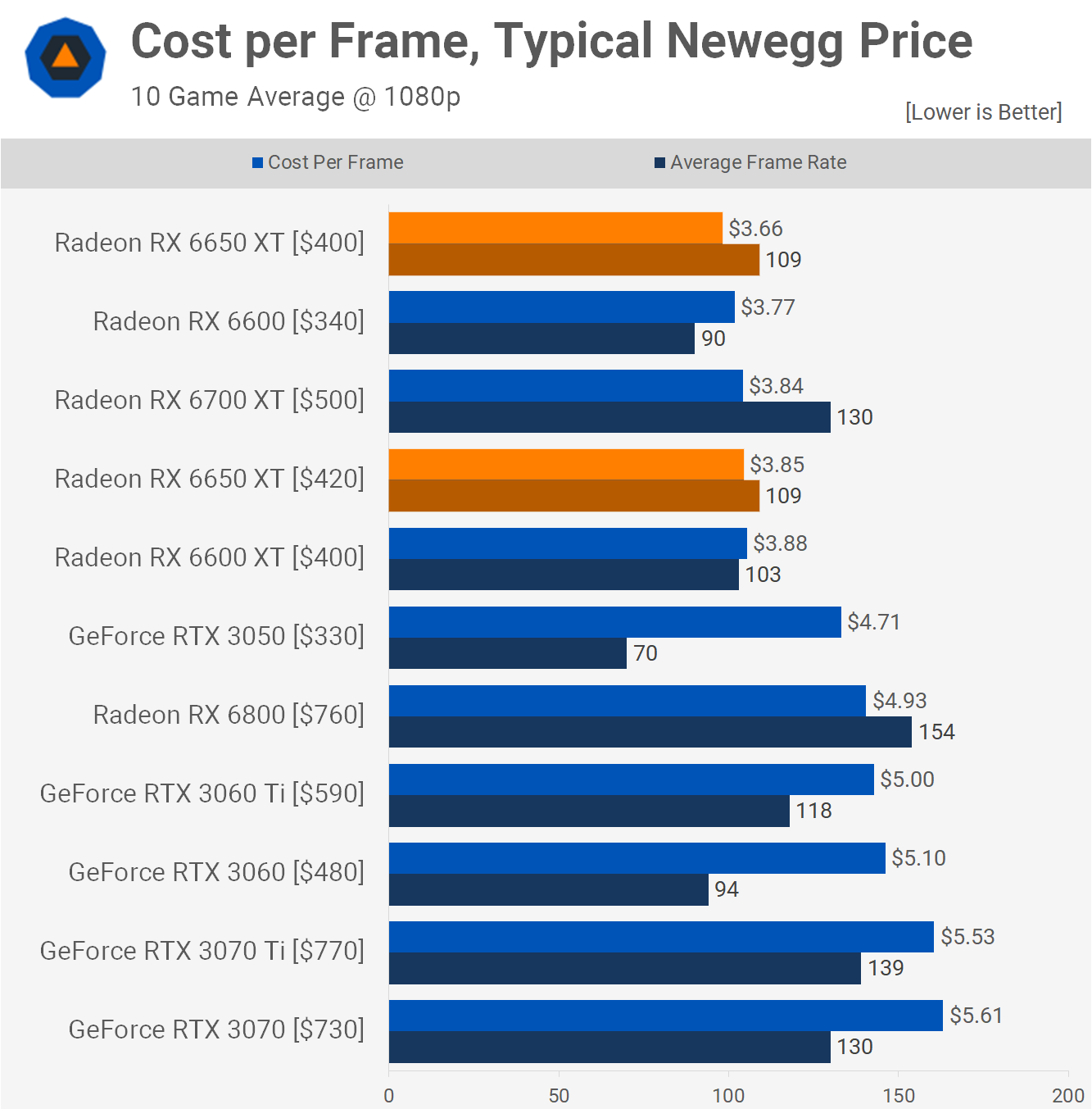 Time to look at current pricing and break down the cost per frame. We've included the 6650 XT at the $400 MSRP, but since the 6600 XT is currently selling for $400 and the 6650 XT is meant to be $20 more, it makes sense to compare the new GPU at a $20 premium, so $420...