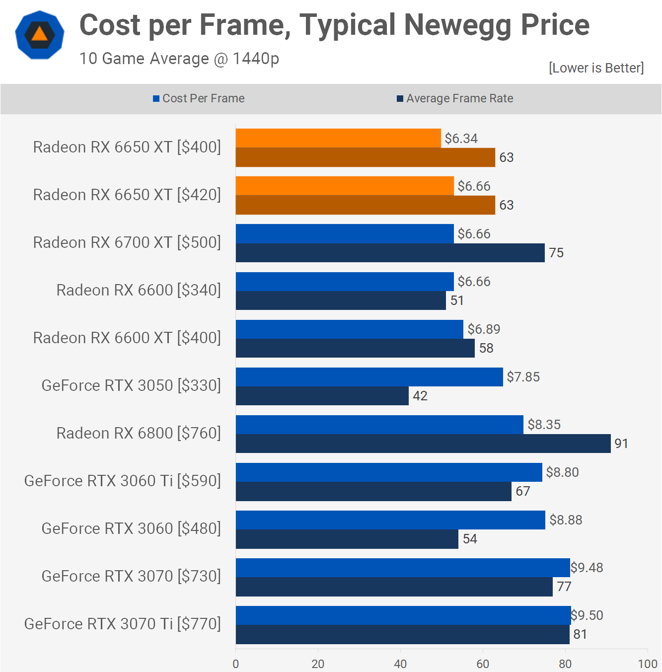 Basically that brings the 6650 XT inline with the 6700 XT and 6600 and that means it's better value than the RTX 3060 at $480, which amounts to a 25% saving when comparing cost per frame.