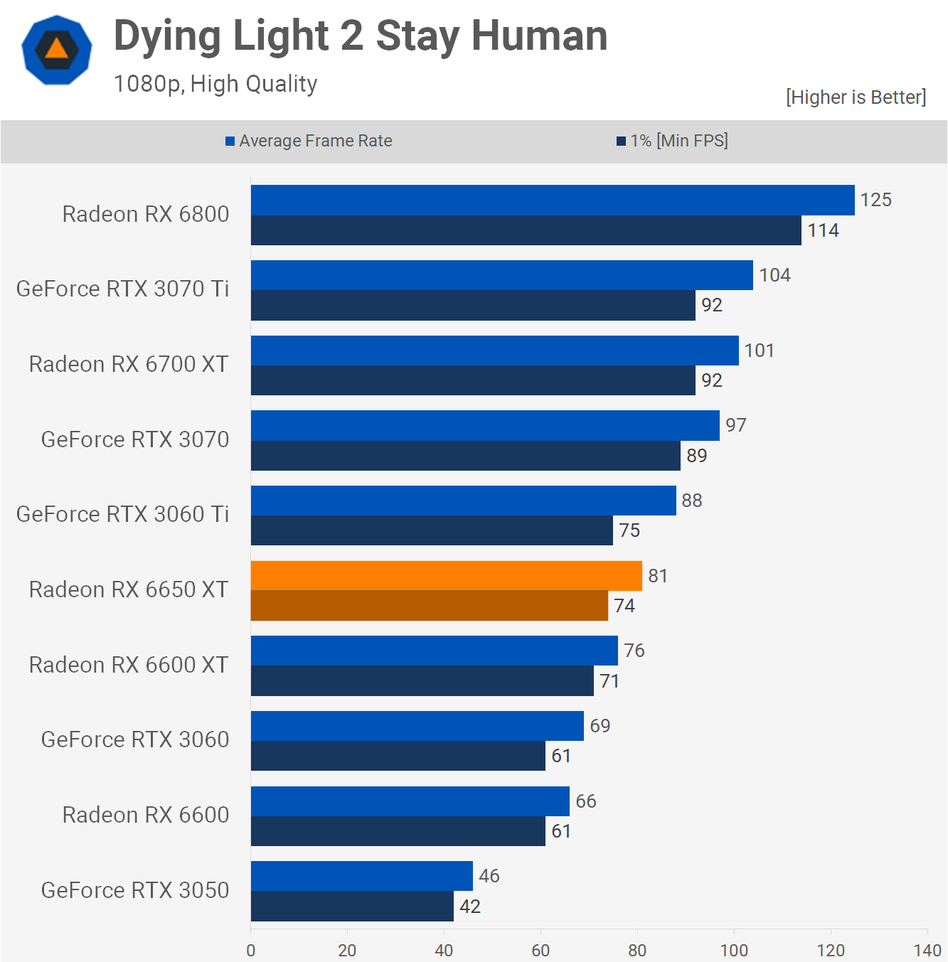 Next is Dying Light 2 – and thankfully we're near the end of this boring benchmark session – we find a 7% boost for the 6650 XT over the 6600 XT and that means it's 17% faster than the RTX 3060.
