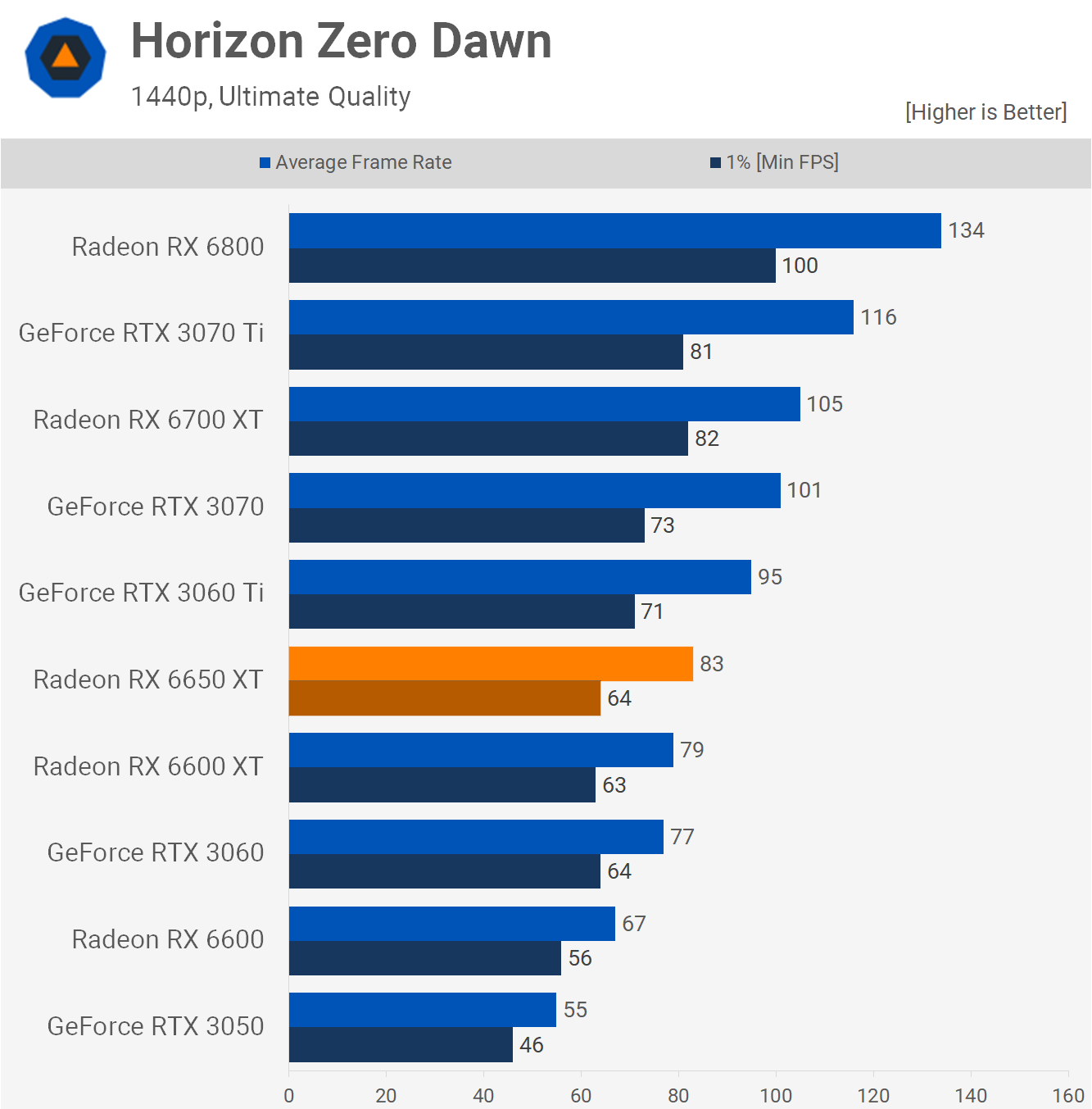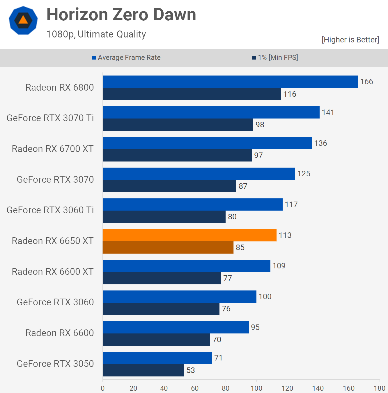 The improvement to the average frame rate in Horizon Zero Dawn at 1080p is underwhelmight, here we're looking at a 4% boost for the 6650 XT over the 6600 XT, though that did make it 13% faster than the RTX 3060, so I guess there is that.