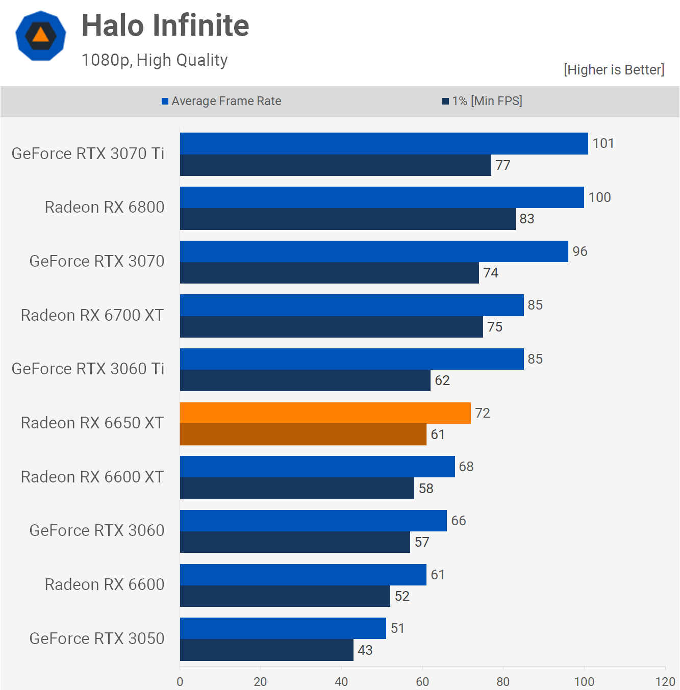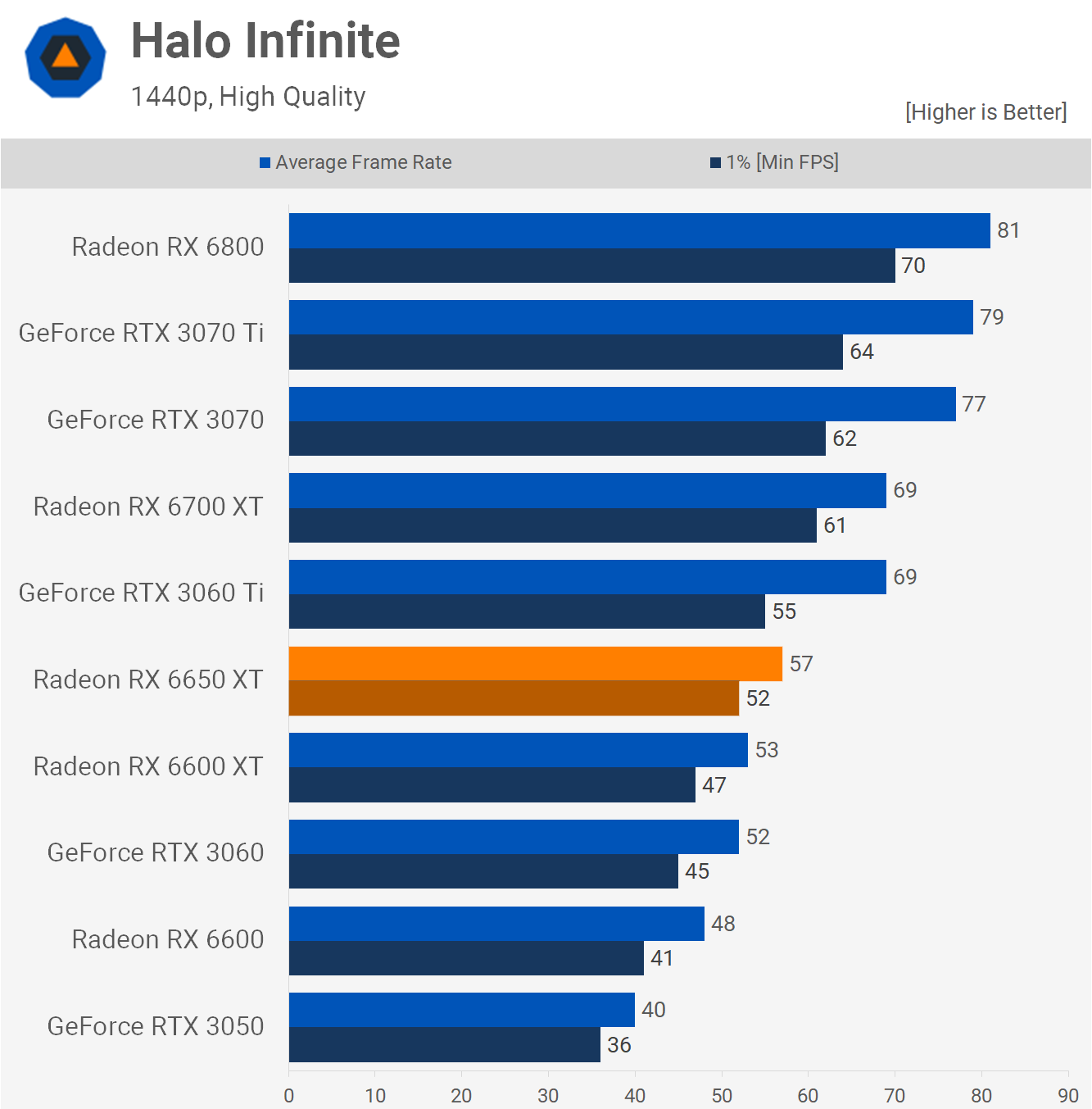 Finally, we have Halo Infinite where we see a 6% increase for the 6650 XT over the 6600 XT and that meant it was just 9% faster than the RTX 3060 at 1080p.