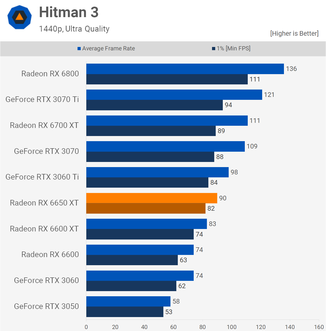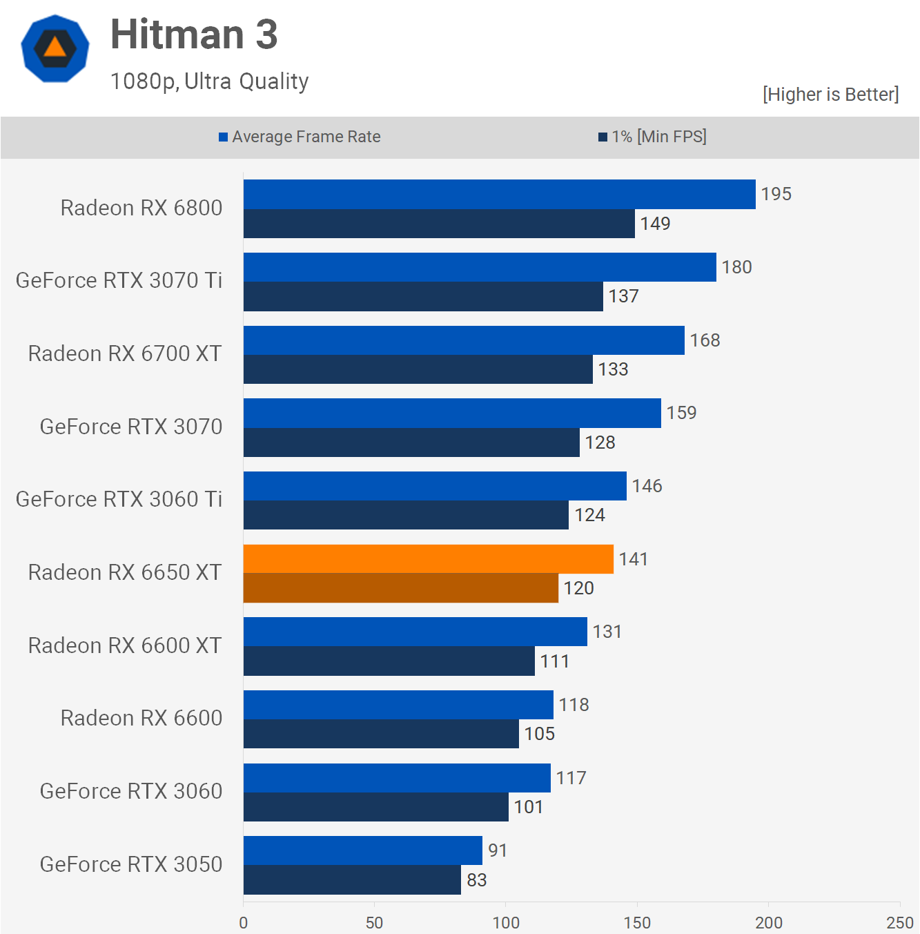 Hitman 3 sees an 8% increase for the 6650 XT over the 6600 XT and that meant it was a massive 21% faster than the RTX 3060. Another good win for AMD, even if the 6650 XT is underwhelming relative to the original model.