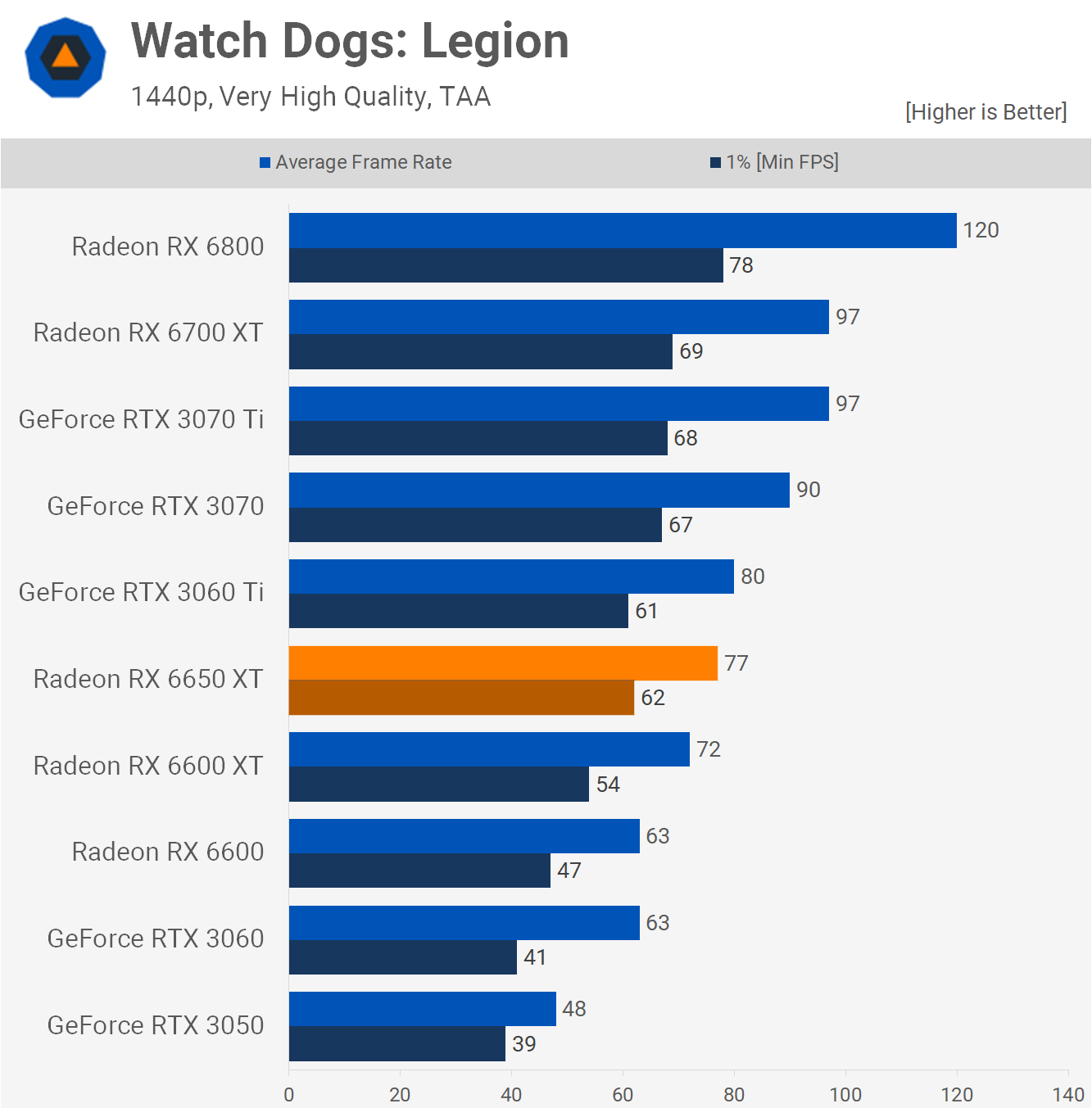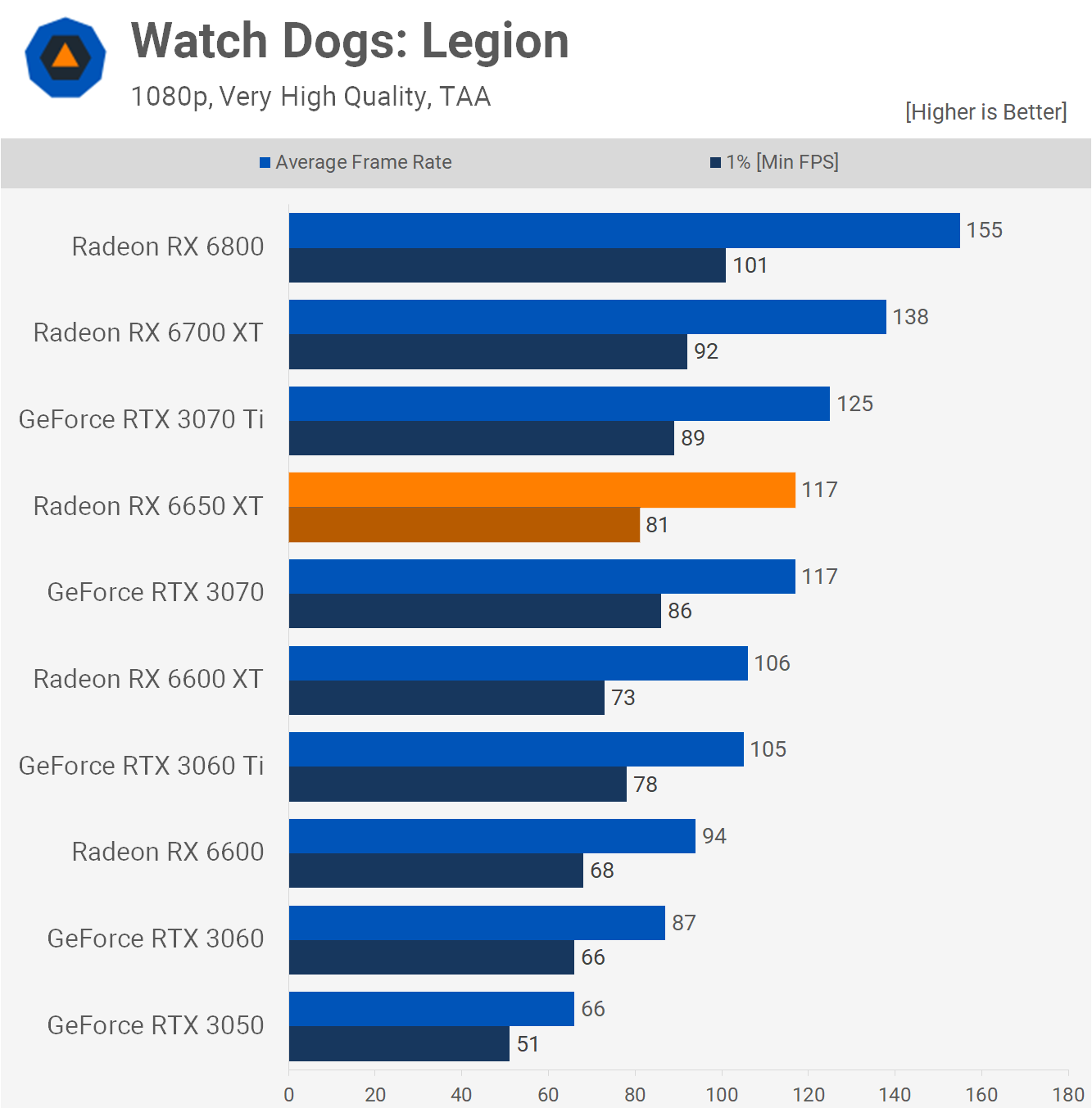 Moving on to Watch Dogs: Legion, the 6600 XT already owned the RTX 3060, offering a massive 22% performance increase, so the 6650 XT just blows that out further to a 34% margin. This is also the biggest gain we're seen over the 6600 XT as the 6650 XT was 10% faster.