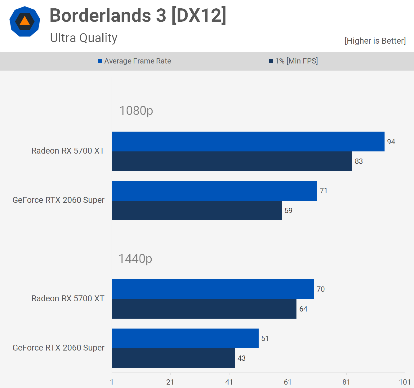 Moving on to Borderlands 3, we'll just note beforehand that since the original test a few months ago, the 5700 XT has seen an 8% increase in performance whereas the RTX 2060 Super has gone unchanged. With the 5700 XT already enjoying a commanding lead in Borderlands 3, the gap has widened which has AMD's lead blown out to a whopping 37% at 1440p.