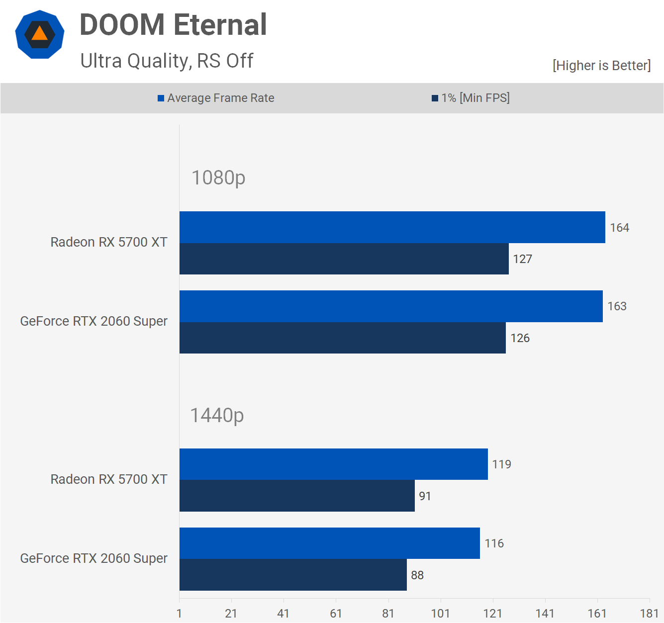 Doom Eternal is another new game and here we see very even performance between these two $400 GPUs. The 5700 XT came out a few frames ahead but we're talking about a negligible difference, so it's a tie. Both averaged well over 100 fps at 1440p, so performance was excellent.