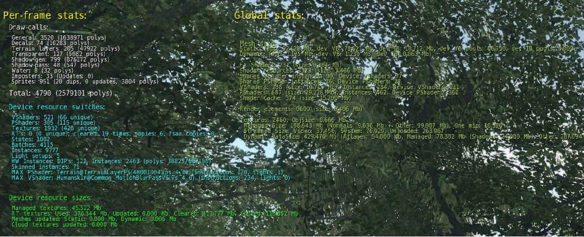 So what exactly was going on to make the game so demanding on hardware? We can get a sense of what's happening behind the scenes by running the title with 'devmode' enabled. This option opens up the console to allow all kinds of tweaks and cheats to be enabled, and it provides an in-game overlay, replete with rendering information.