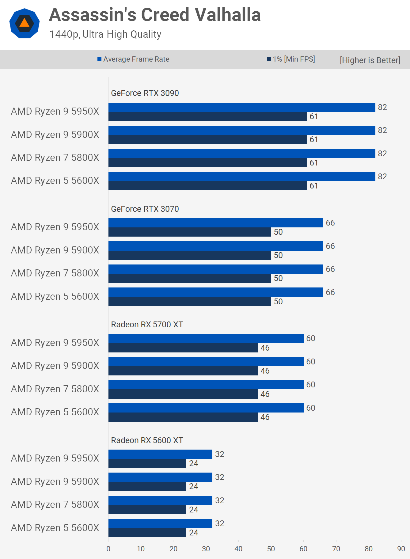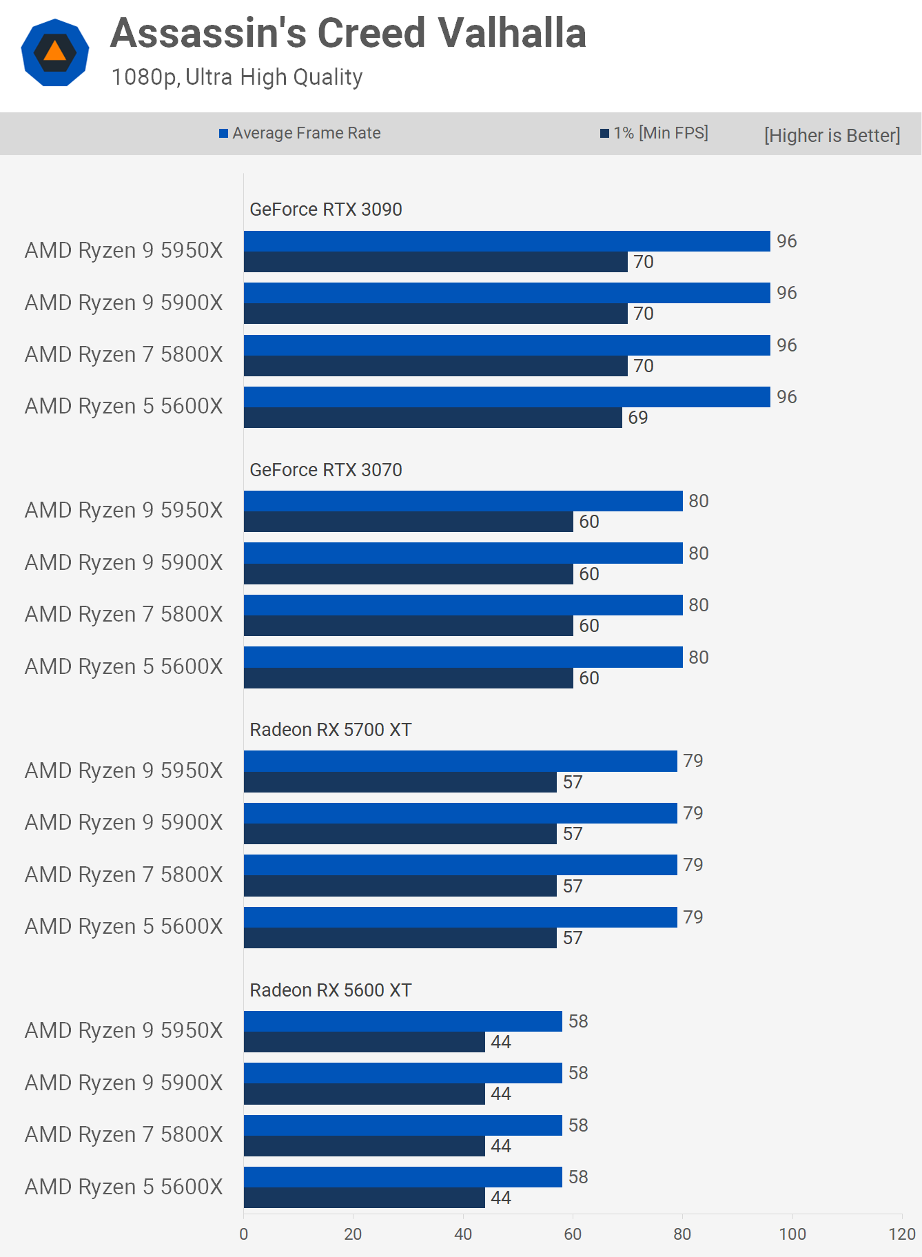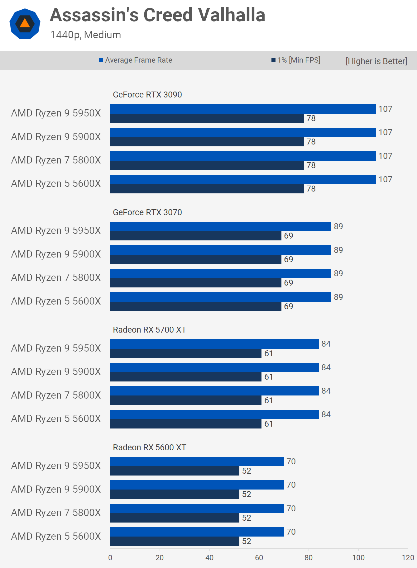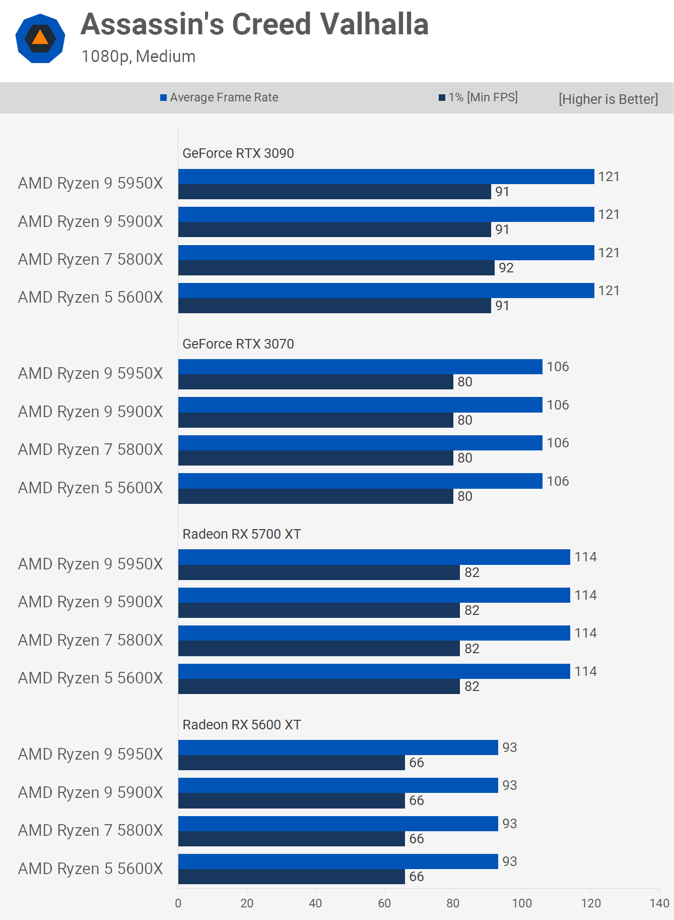 Typically, Assassin's Creed titles are very CPU demanding and AC Valhalla is not an exception, though if you have a CPU as capable as the 5600X, then that's all you'll need. Previous Assassin's Creed titles were known to break quad-core CPUs (4-cores/4-threads), but they've always played well on 12-thread processors.