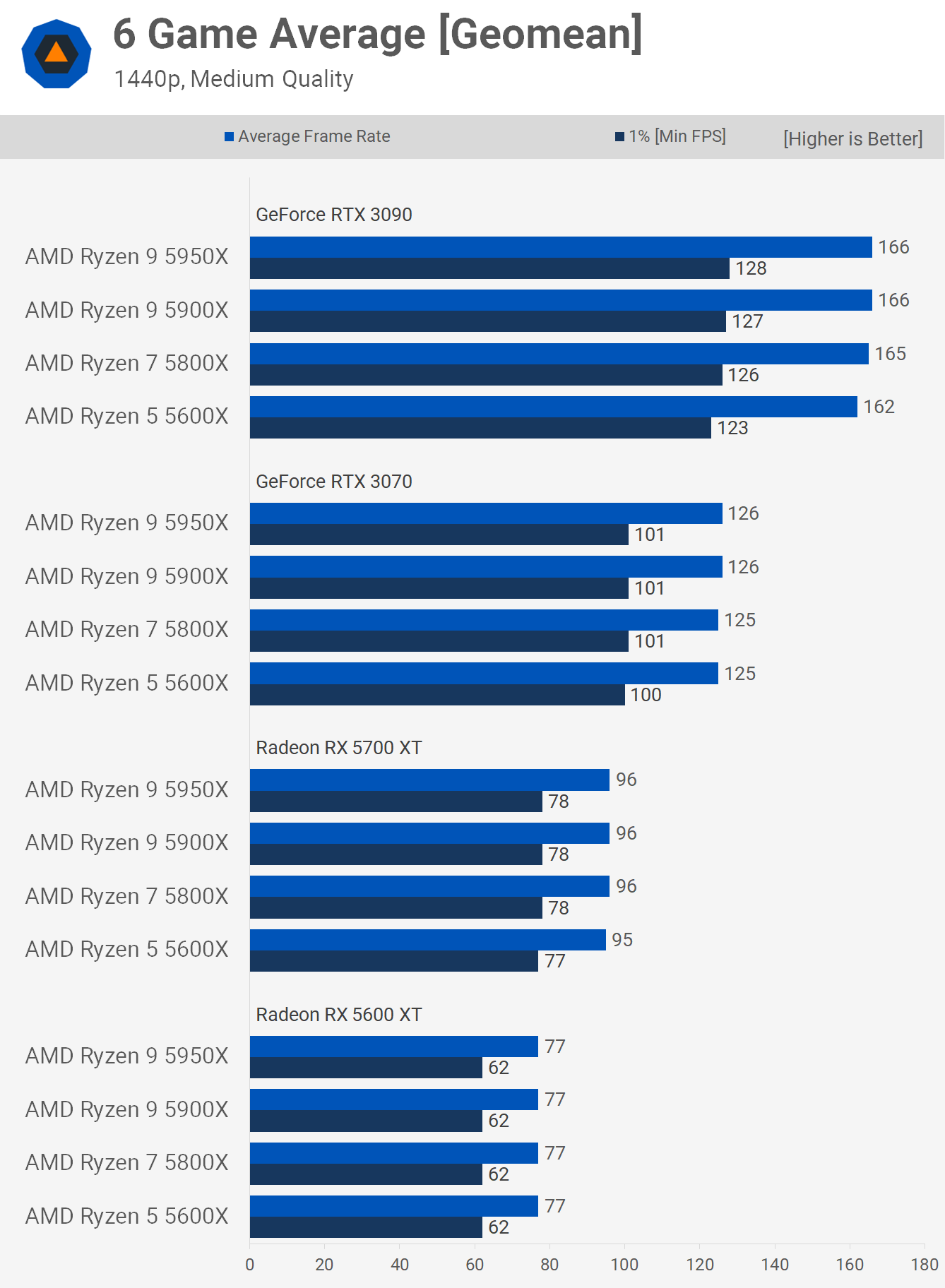 There is some difference at 1440p with the medium quality preset, but even with the RTX 3090 we're only talking about up to a 6% margin between the 5600X and 5950X.