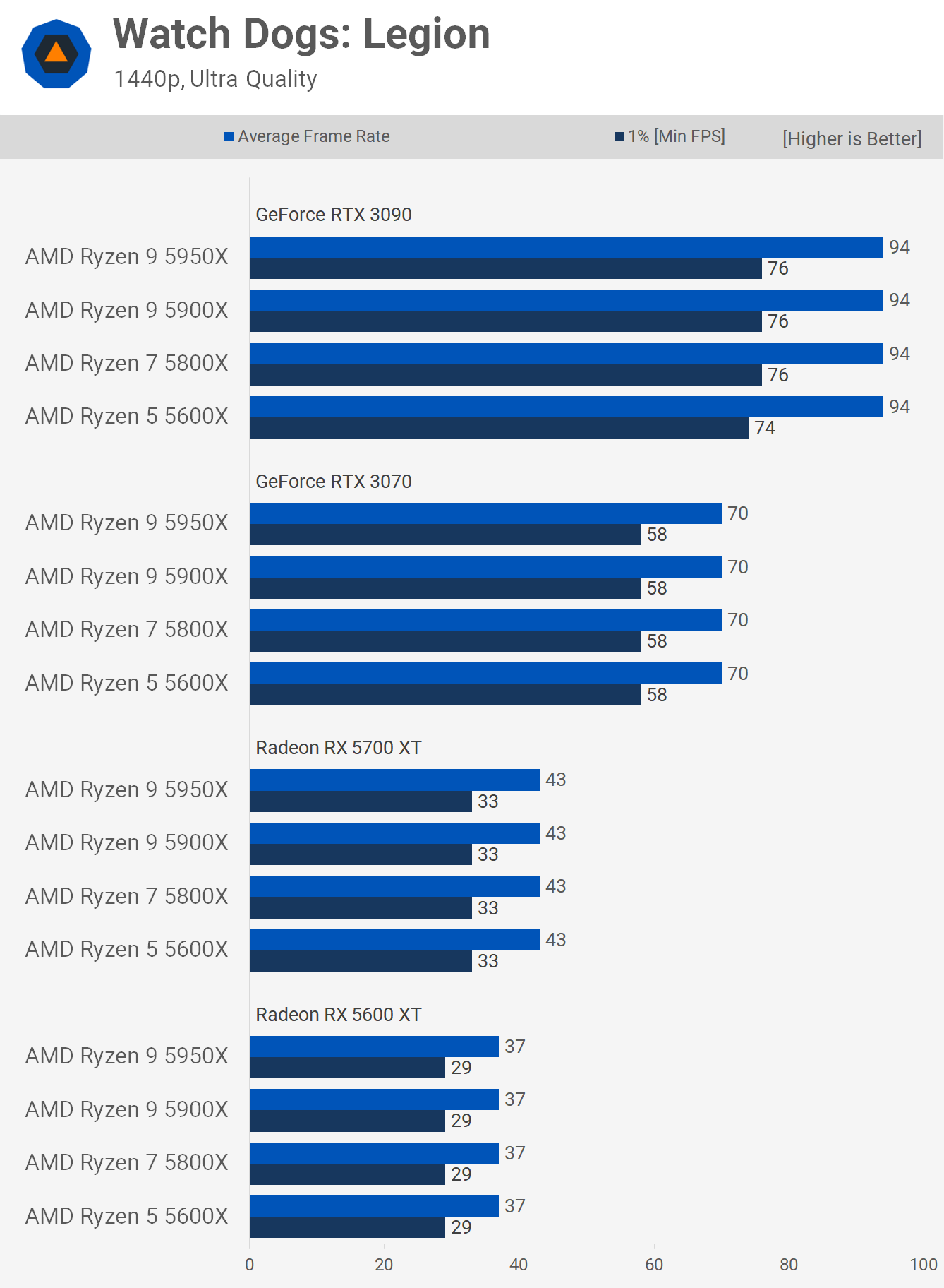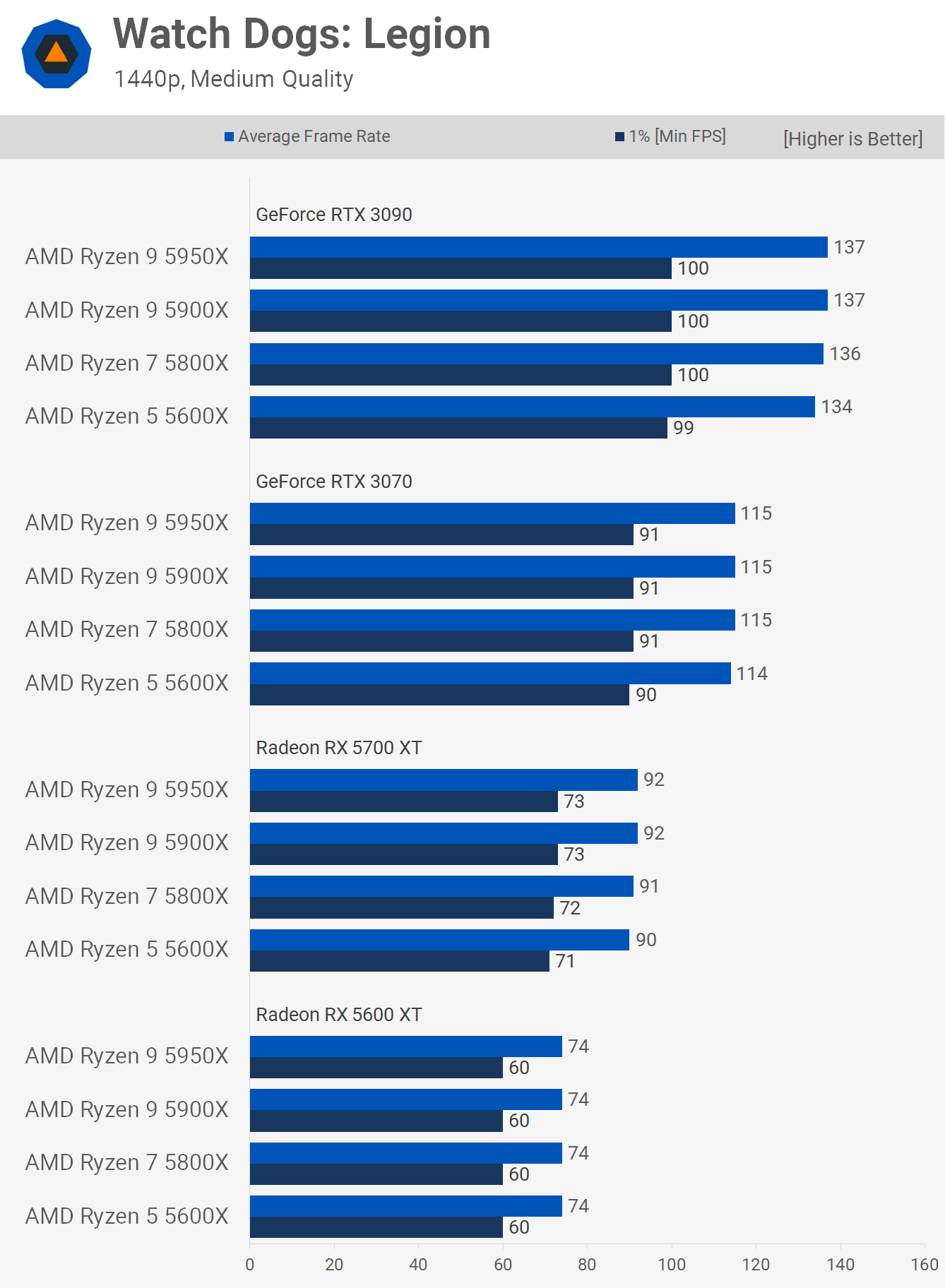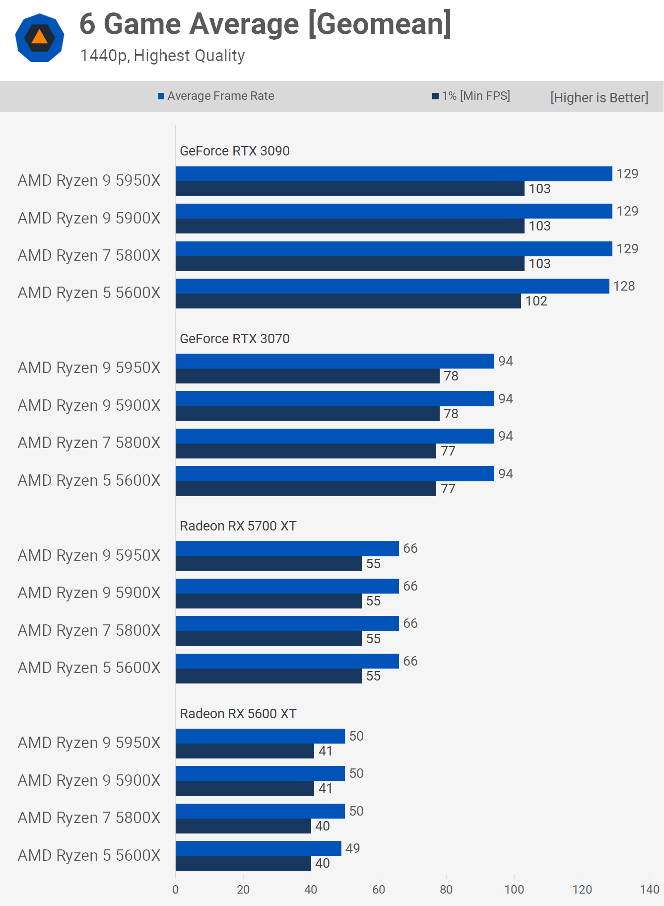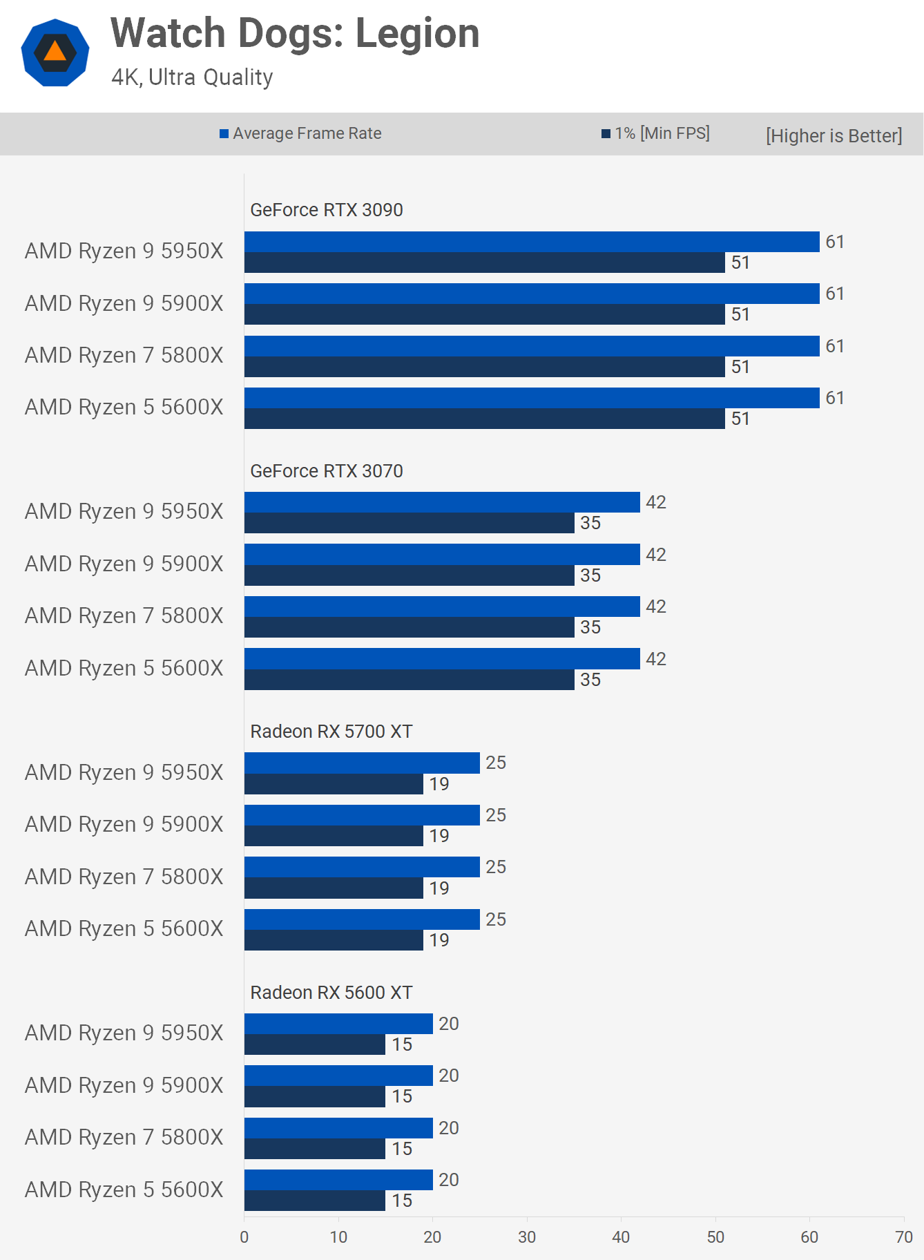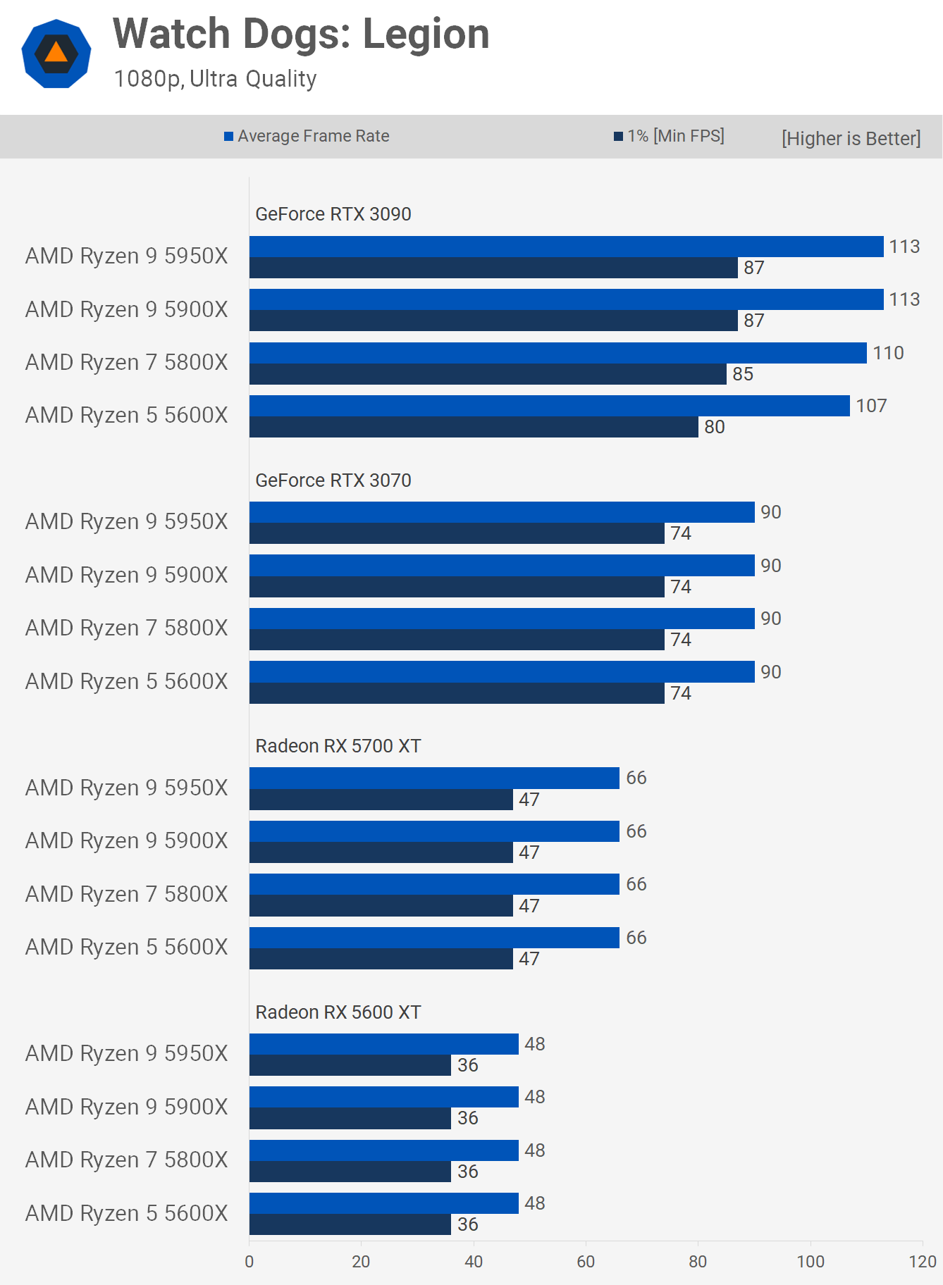 At 1080p using the ultra quality preset we found that on average there is no performance difference to be seen in modern games when using the RTX 3070, 5700 XT and 5600 XT. Again, as seen in the day one review, the 5950X only offers a ~4% performance boost over the 5600X, and with both delivering smooth performance in all games, there's little reason to go beyond the 6-core/12-thread processor.