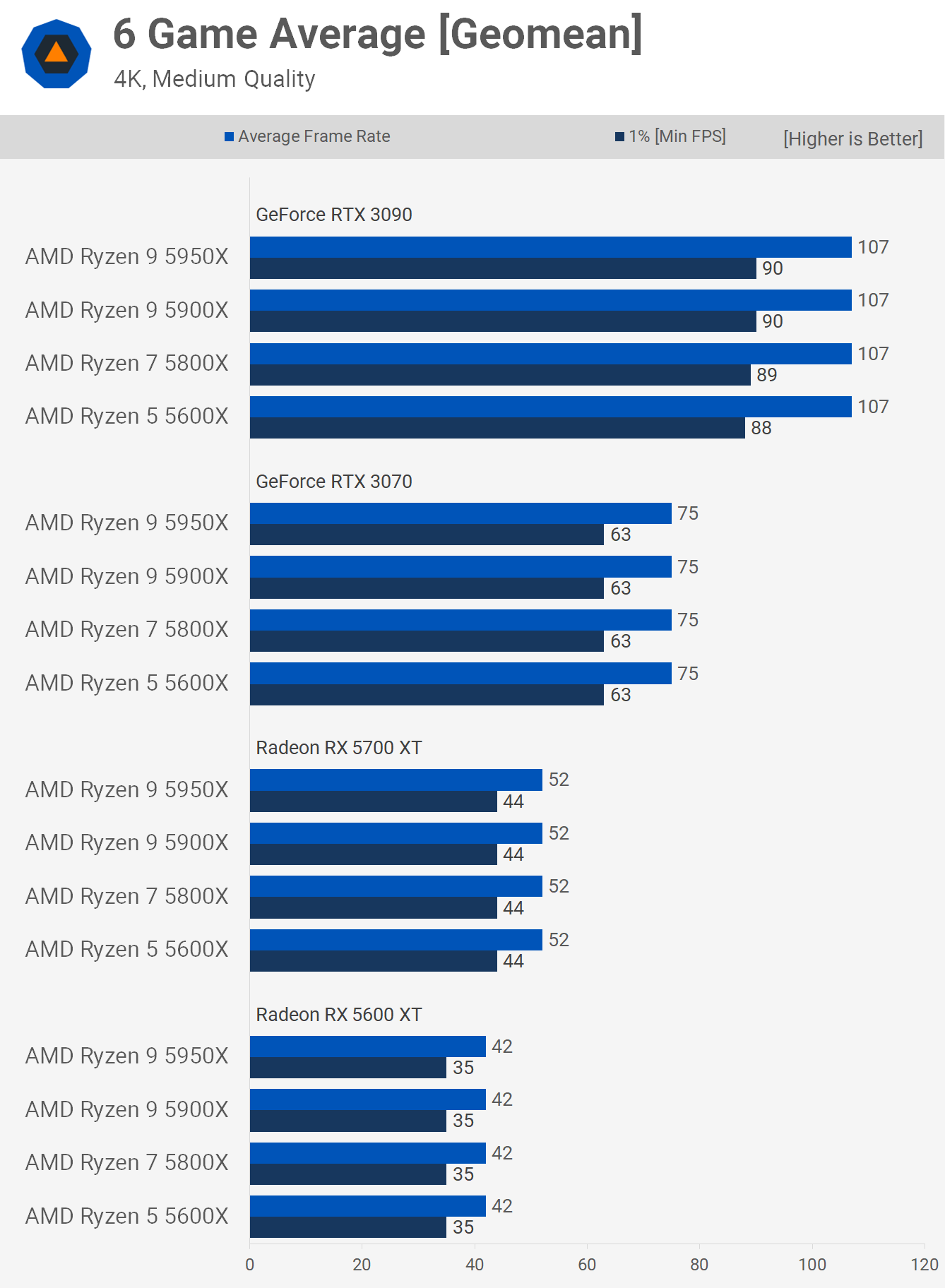 The same is also true of the 4K medium results, doesn't matter which of these Zen 3 CPUs you use, performance will be identical.