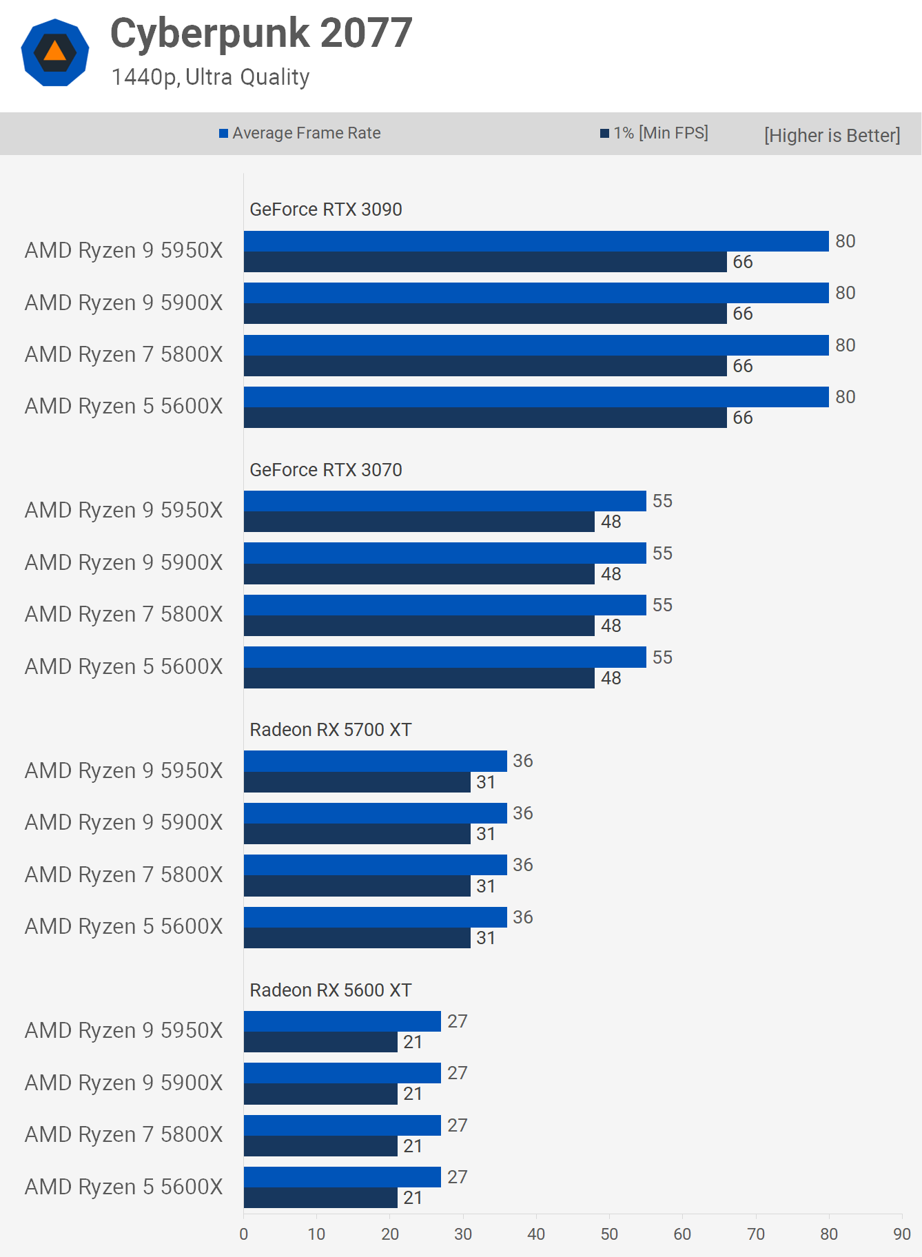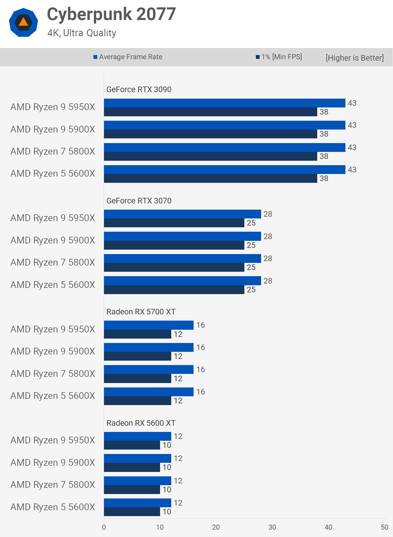 The 5950X was up to 11% faster than the 5600X when comparing 1% low performance with the RTX 3090 and 7% with the RTX 3070, in fact we're even seeing a 5% increase in 1% low performance with the 5700 XT.