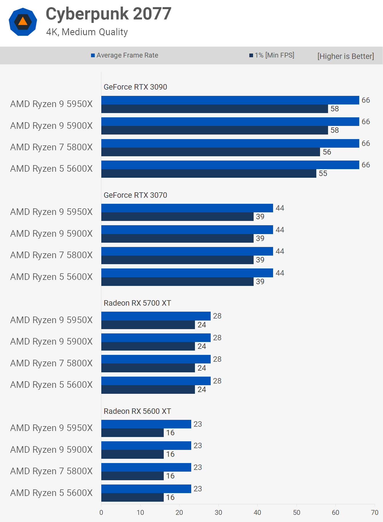 That said, this is only seen with the RTX 3090, dropping down to the RTX 3070 sees the game become largely GPU limited, there is still some variation in the 1% low performance, but we're talking at most a 6% discrepancy. Once we drop down to the 5700 XT all CPUs are seen delivering the exact same level of performance.