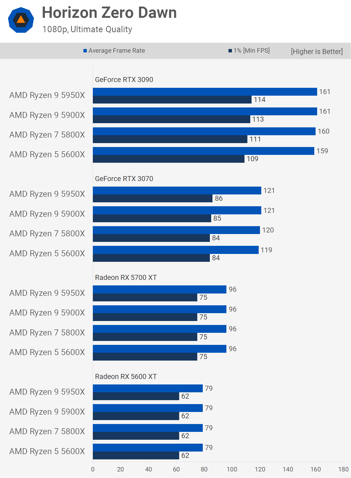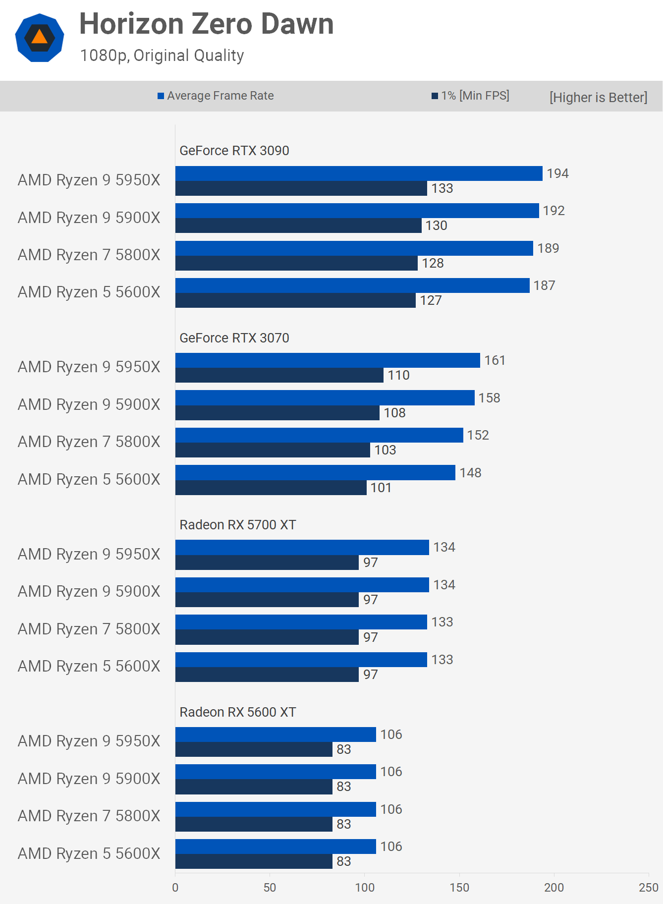 Horizon Zero Dawn isn't a very CPU demanding game and I've found in the past you'll be GPU limited even at 1080p with an RTX 3090 using any modern Intel or AMD CPU. That being the case you might think it's not a suitable game for this kind of test and while a case for that can certainly be made, I feel it's important to include new triple A titles that like most games, aren't limited by CPU performance, at least within reason.