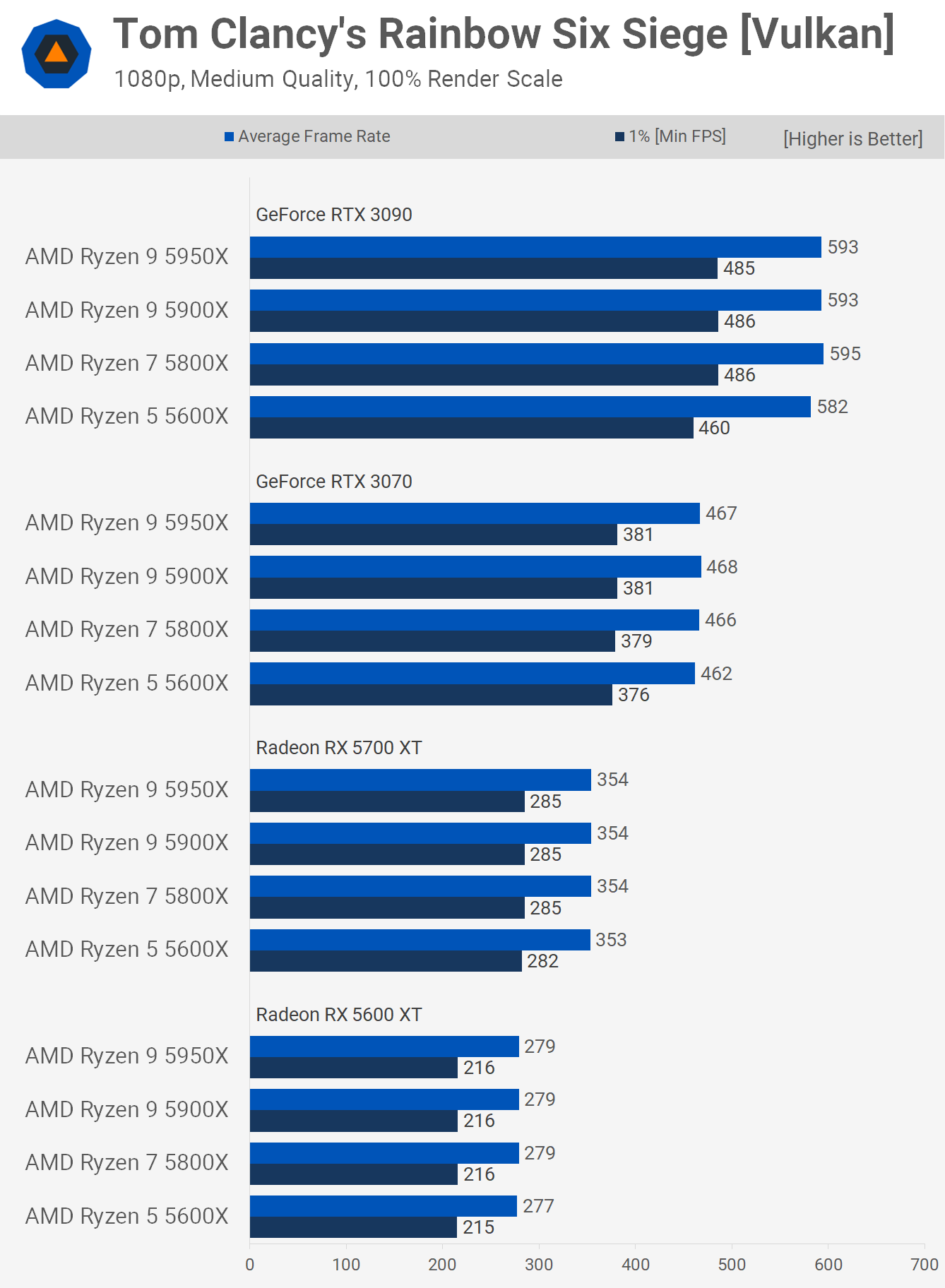 The margins grow quite considerably when lowering the visual quality settings to medium as the 5950X is up to 18% faster than the 5600X and quite interestingly that was seen with the RTX 3070, though we're only talking about a 7% difference when comparing the average frame rate. It's worth noting that once we dropped down to the 5700 XT that all four Zen 3 processors delivered the same level of performance.