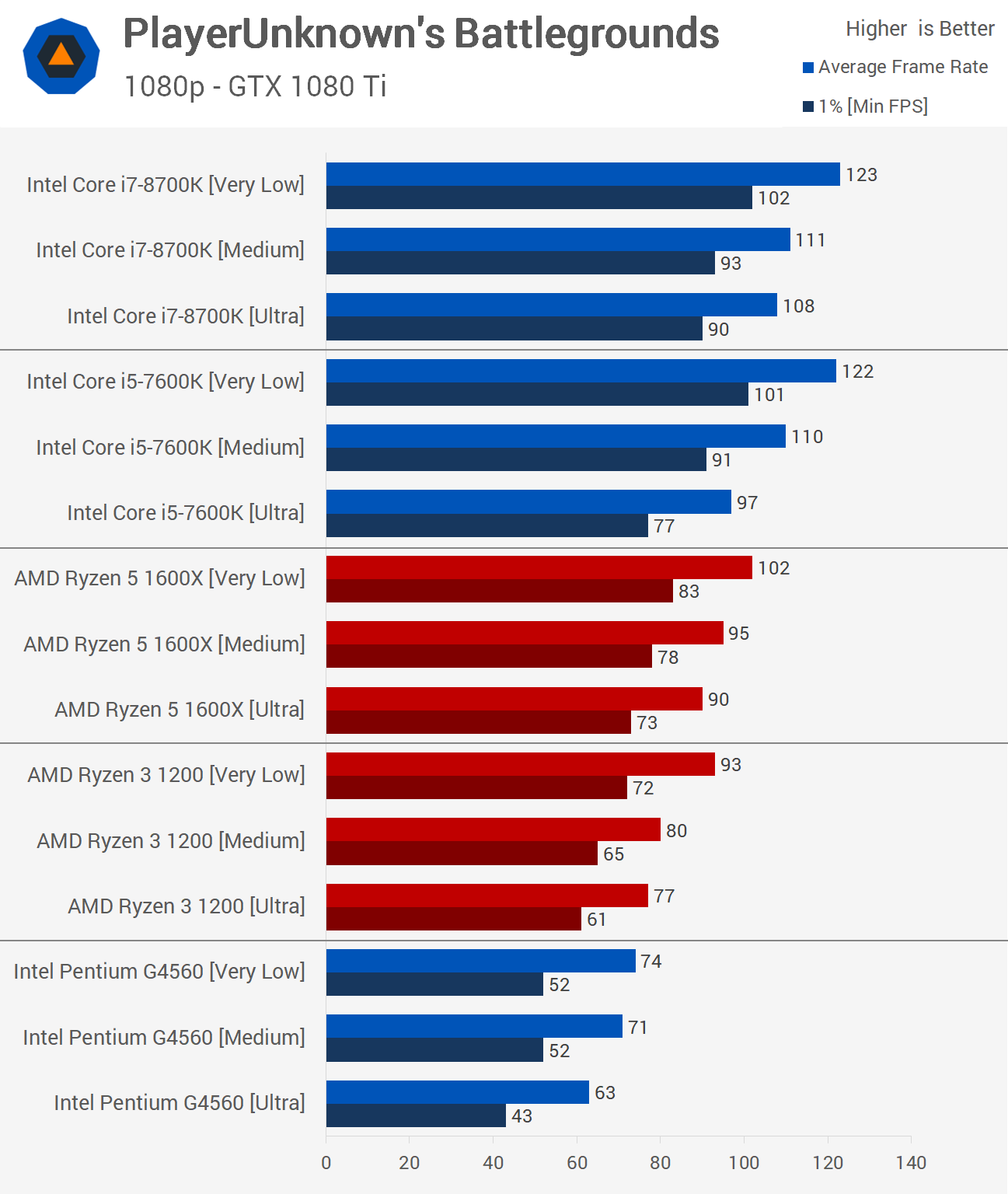 It's been six months since we last tested PlayerUnknown's Battlegrounds and it's safe to say that the game still requires further optimization. Shoddy Ryzen support aside, even the Core i7-8700K and GTX 1080 Ti combo was very underwhelming – an average of 123fps at 1080p using the minimum quality settings is pathetic.