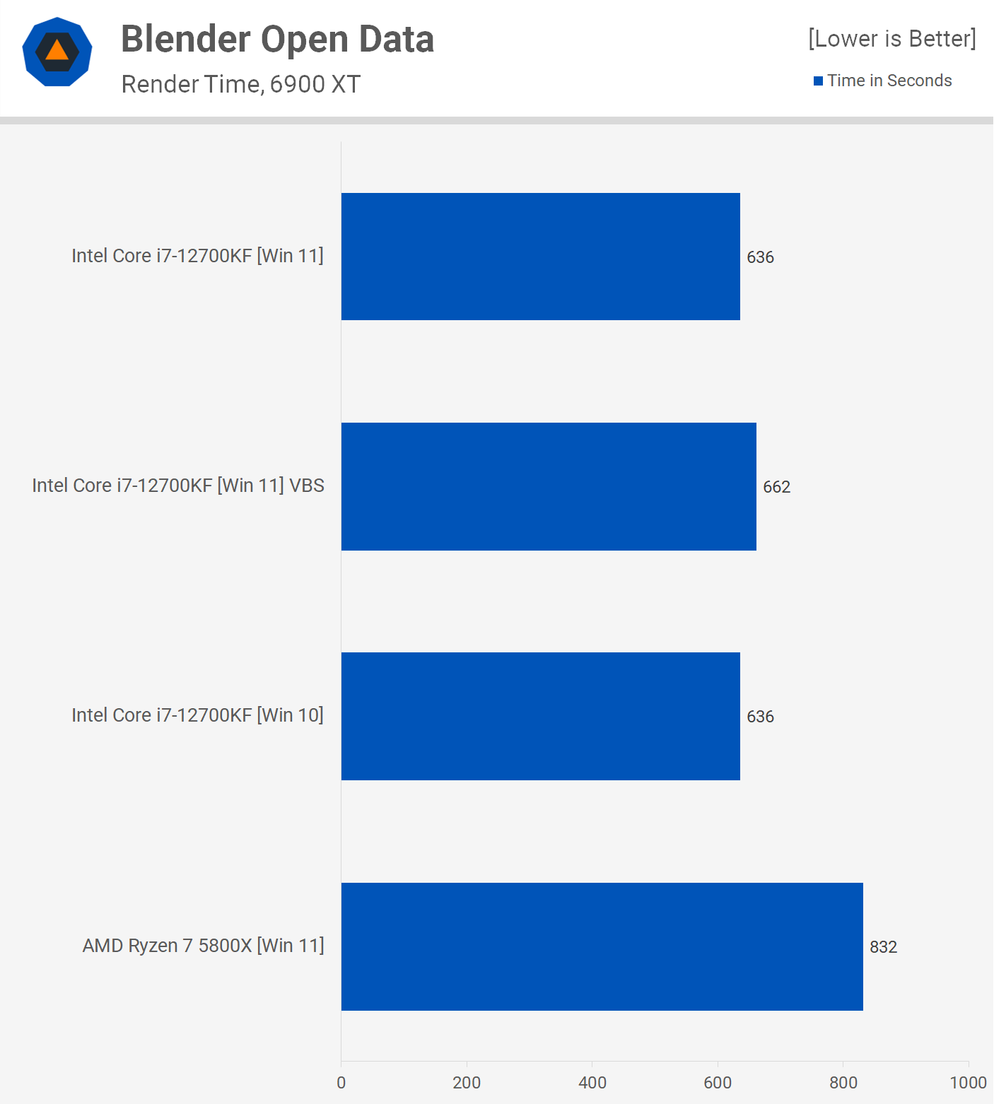 The last application benchmark we're going to look at is Blender Open Data and here we find that Windows 10 and 11 produce the exact same result, a completion time of 636 seconds. Enabling VBS slowed Windows 11 down to the tune of 4%, which is not significant, but it does make Windows 11 appear slower than 10 when in fact it's not.