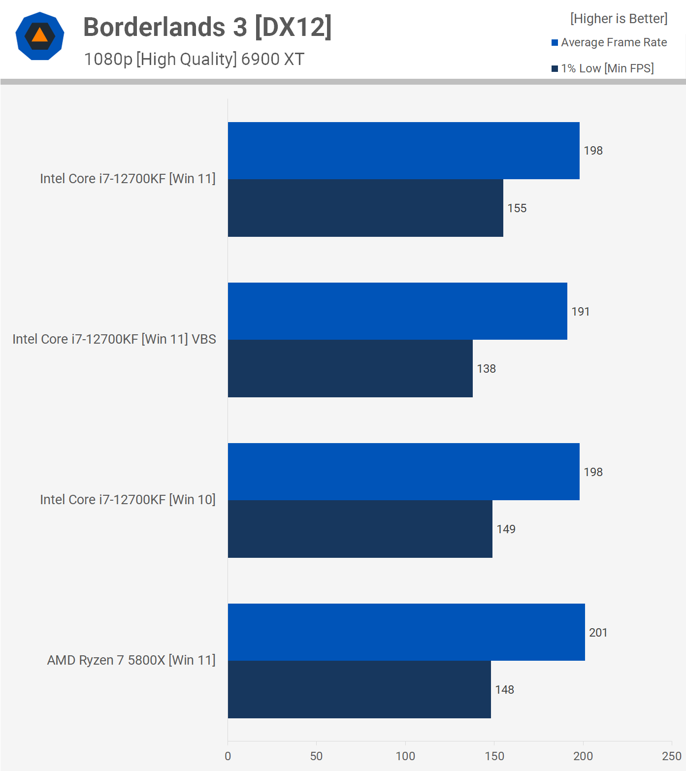 The Borderlands 3 results are on the boring side as both Windows versions are much the same. Enabling VBS does reduce Windows 11 performance by up to 11%, seen when looking at the 1% low data.