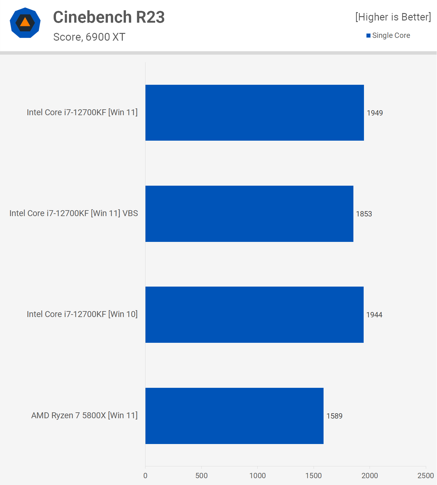 Starting with the Cinebench R23 multi-core results, we see that the difference between Windows 10 and Windows 11 is non-existent with both operating systems able to maximize the performance of Intel's latest Core i7 processor. That said, you will see around a 5% drop in performance with VBS enabled, which is not a massive difference, but it's worth being aware of.