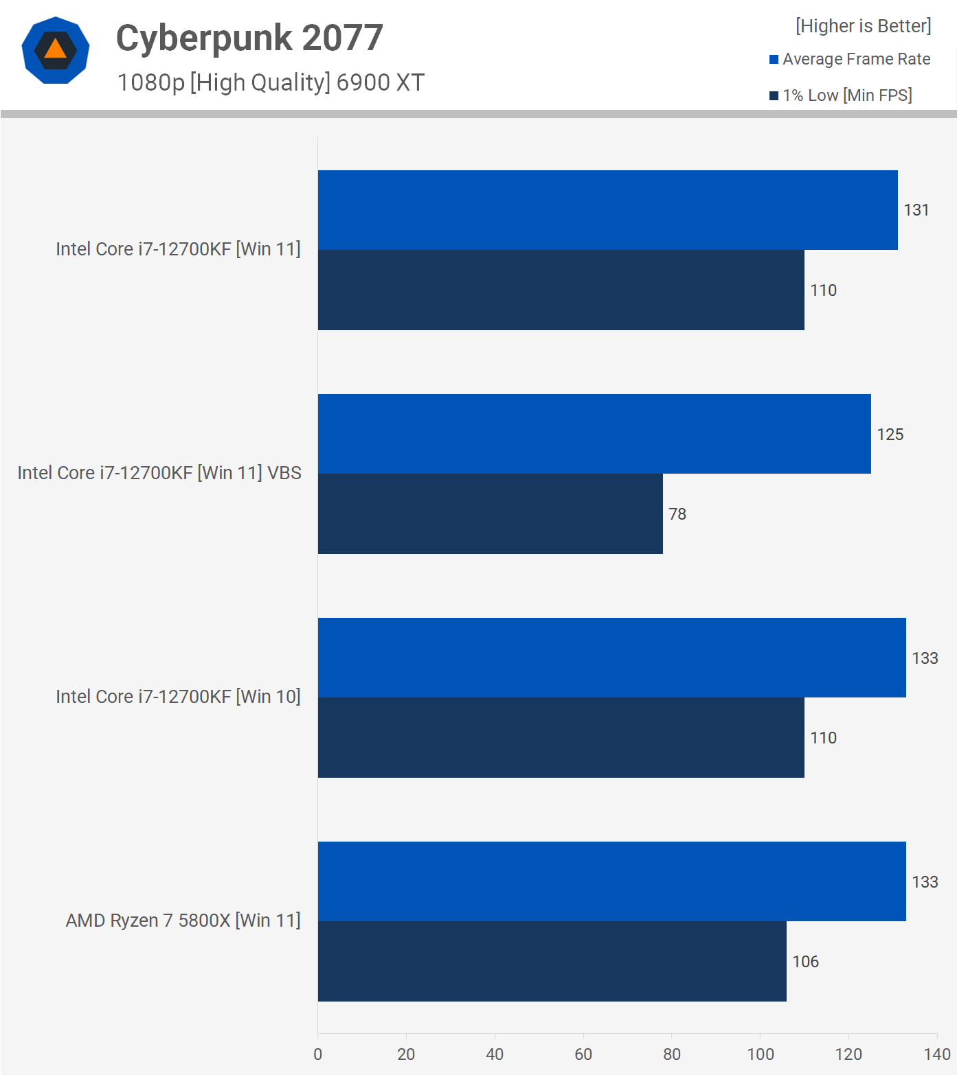 Finally we have Cyberpunk 2077 where both Windows 10 and 11 performed similarly. However, enabling VBS destroyed 1% low performance in this title.